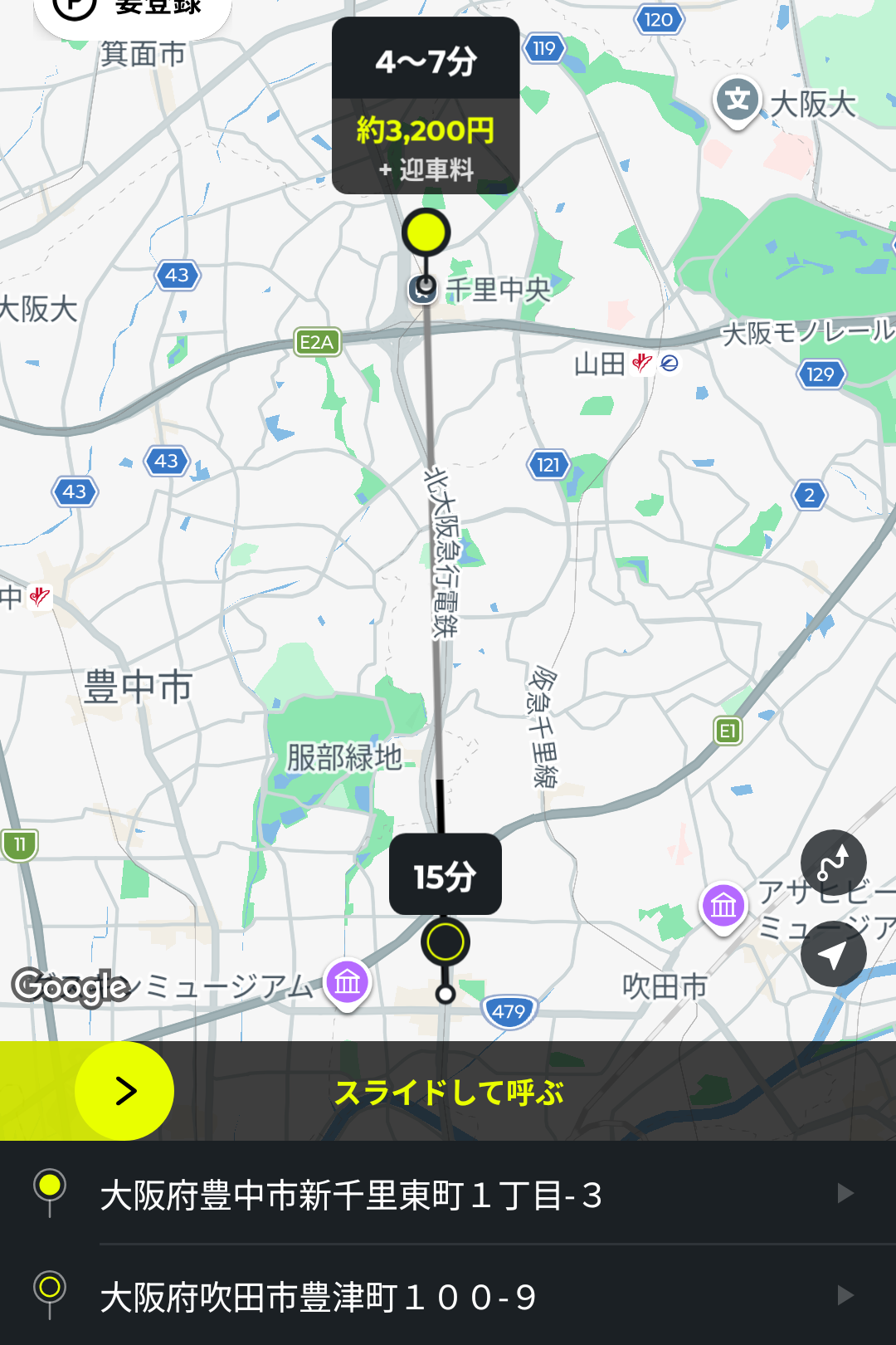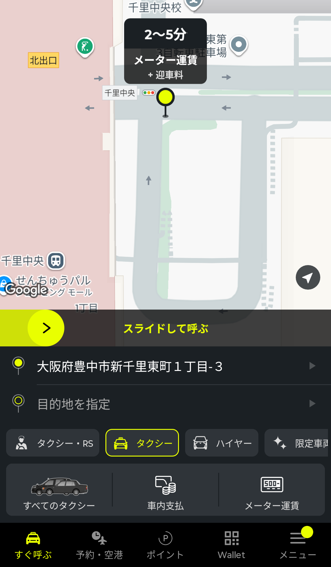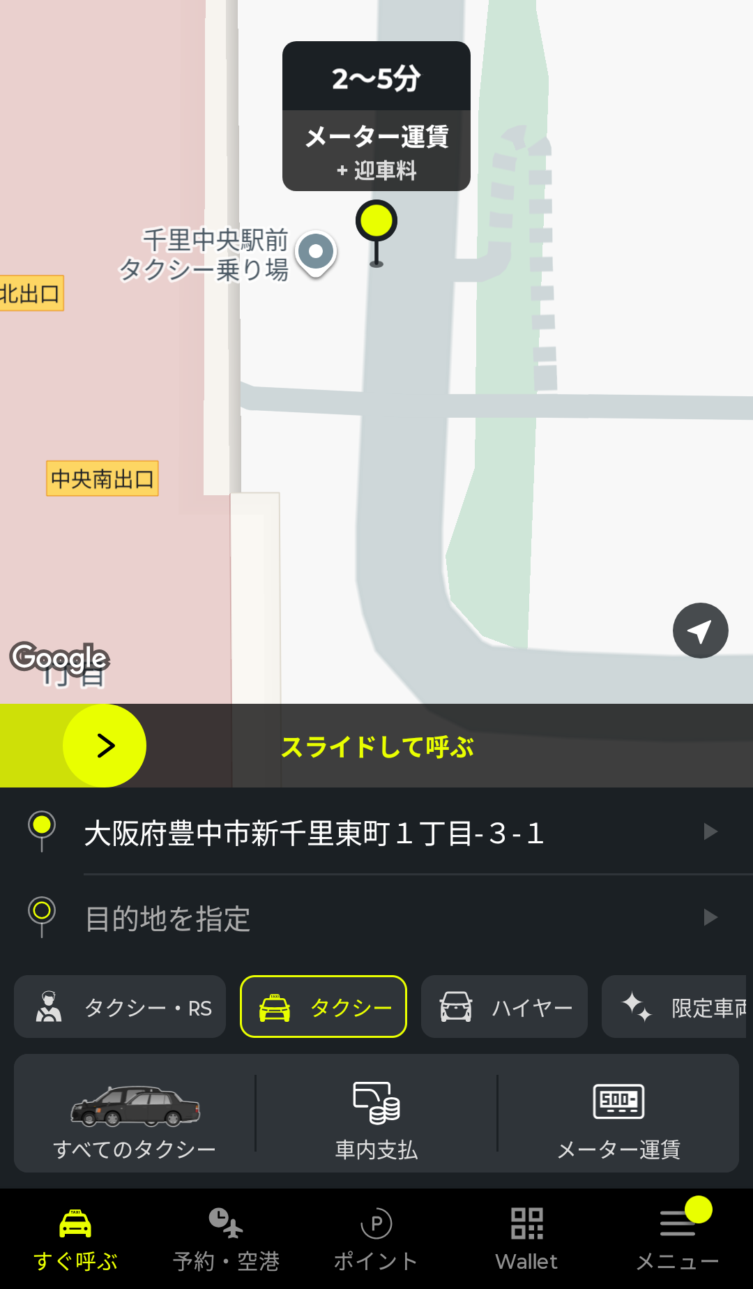 あとは、画面中央の黄色いバーをスライドすると、配車依頼ができます。