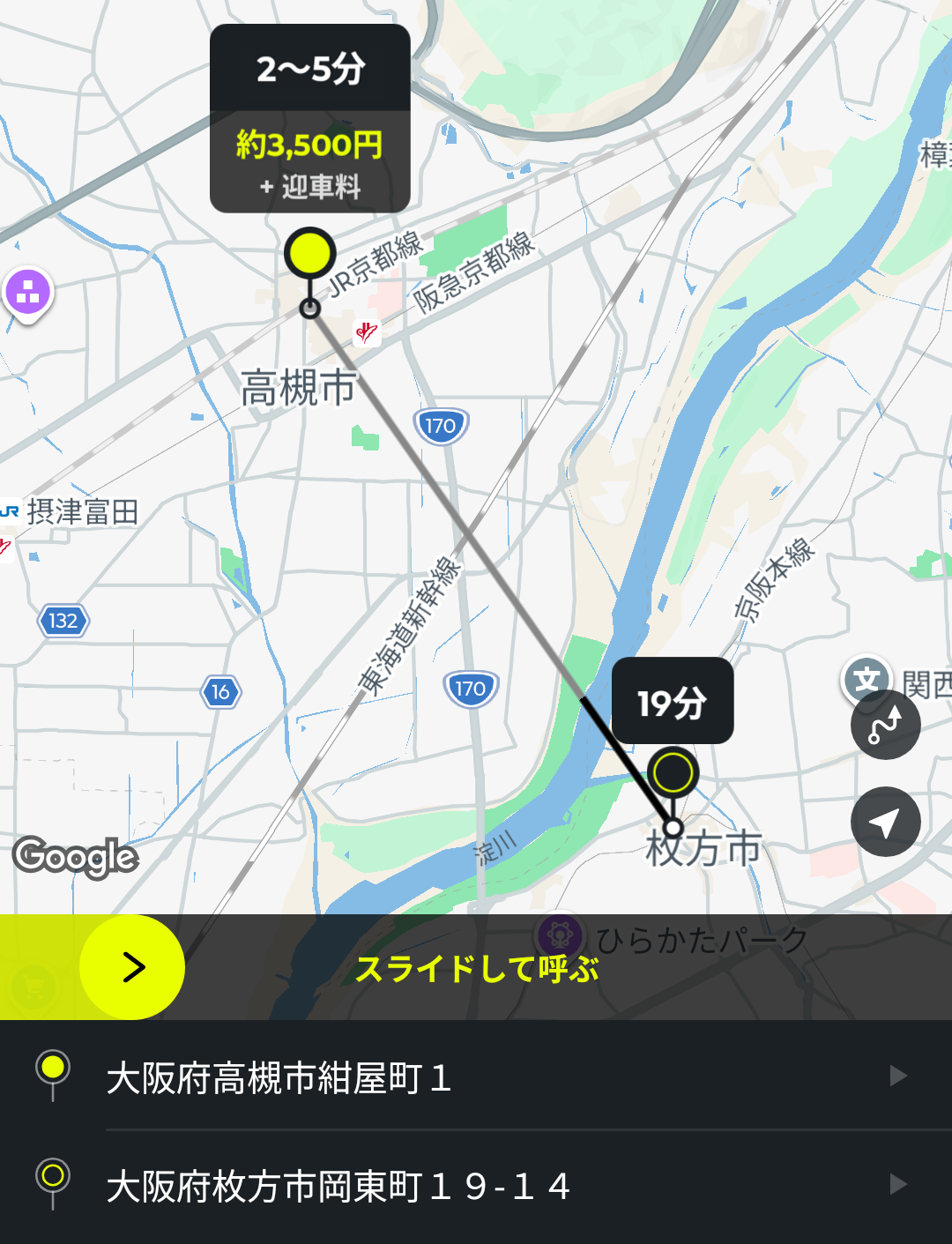 あとは、画面中央の黄色いバーをスライドすると、配車依頼ができます。