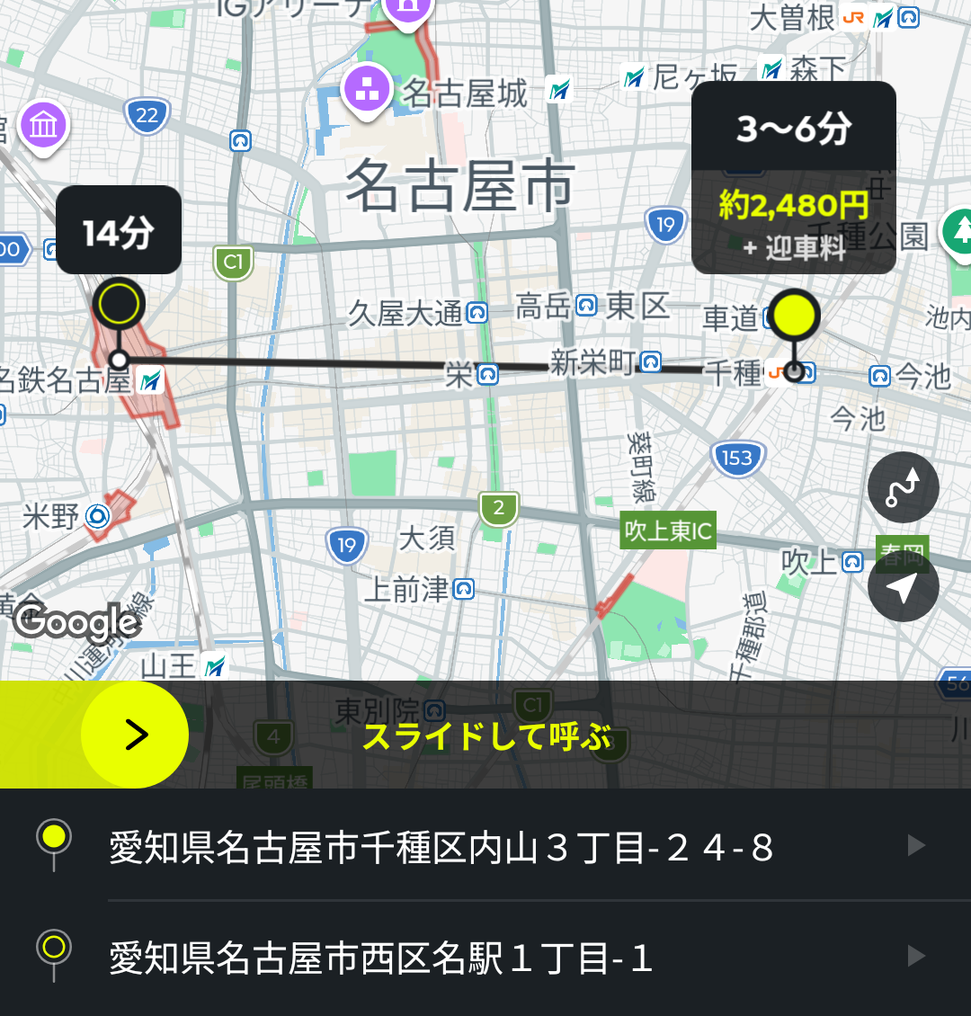 また、実際に配車依頼をしなくても、乗車・降車地点を入力するだけで、実際の道路状況を考慮して目的地までの料金や到着時間の目安を表示してくれるので、これはこれでけっこう便利だったりします。