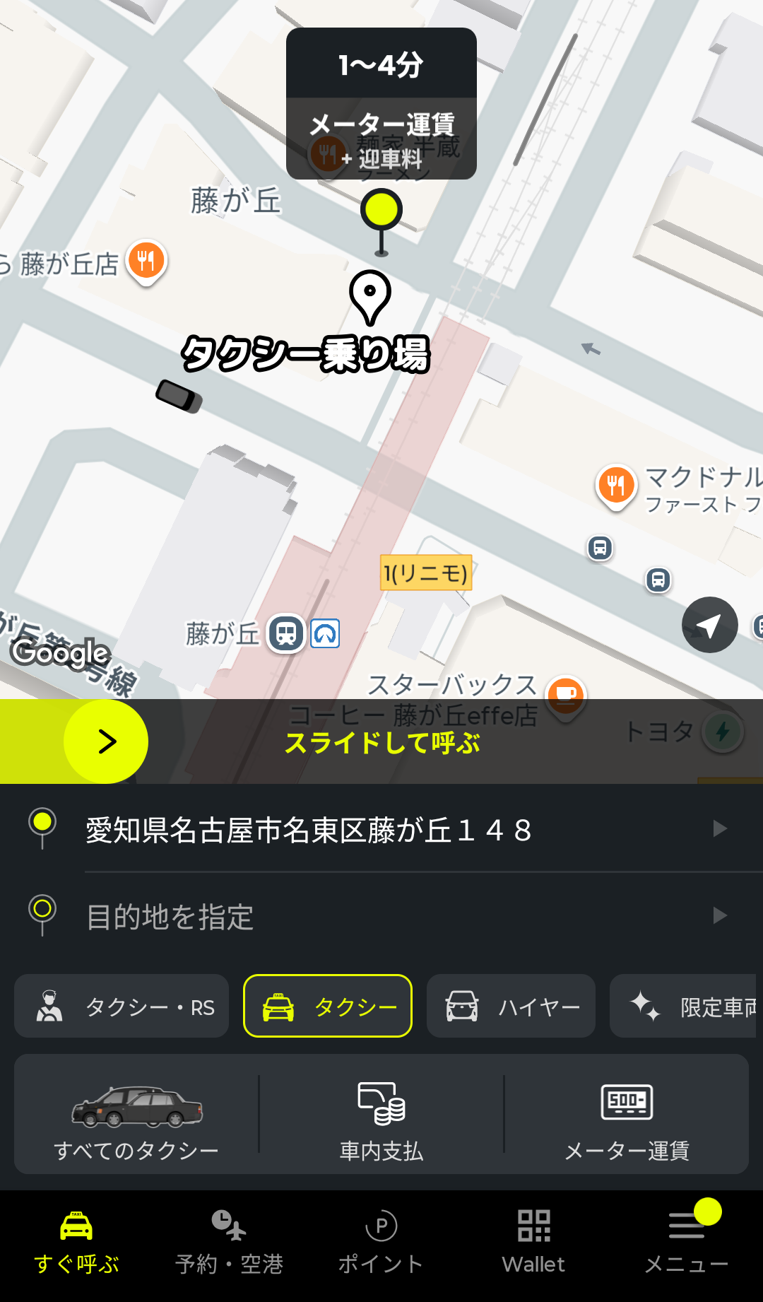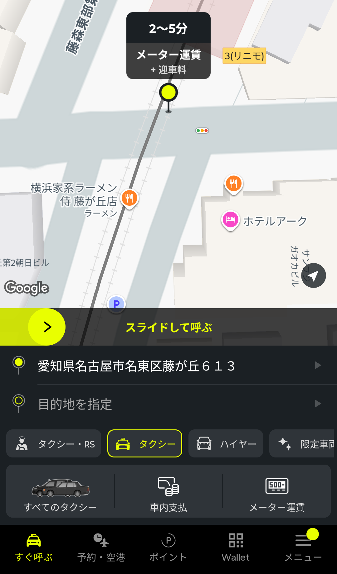 ちなみに、アプリで配車依頼をすると、迎車料金(目安:300〜500円)がかかります。
