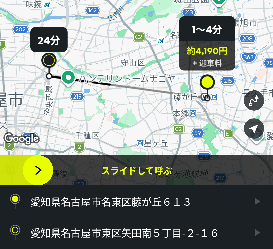 あとは、画面中央の黄色いバーをスライドすると、配車依頼ができます。