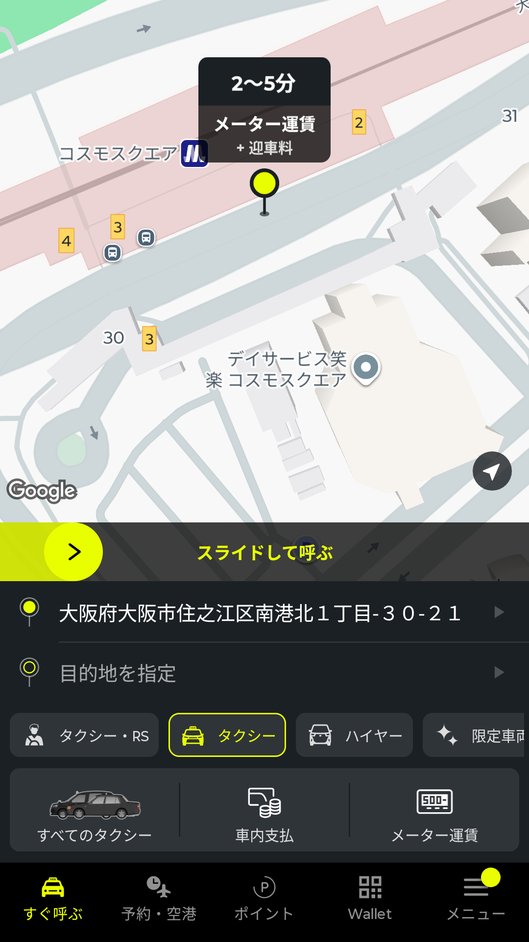 ちなみに、アプリで配車依頼をすると、迎車料金(目安:300〜500円)がかかります。