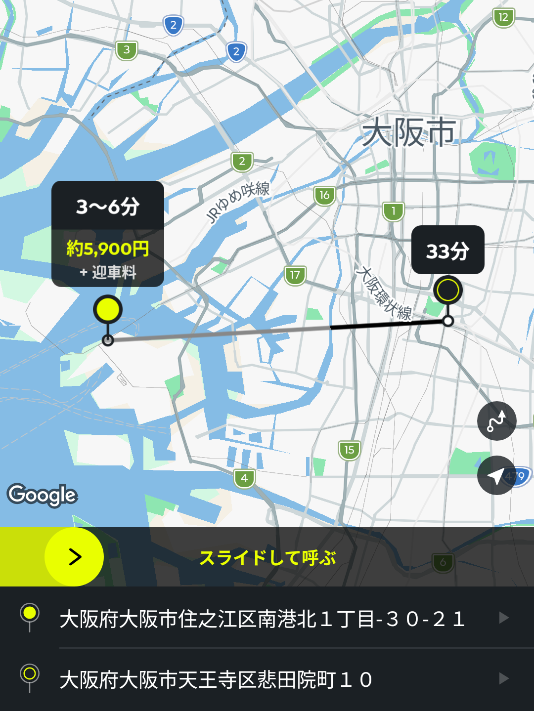 あとは、画面中央の黄色いバーをスライドすると、配車依頼ができます。