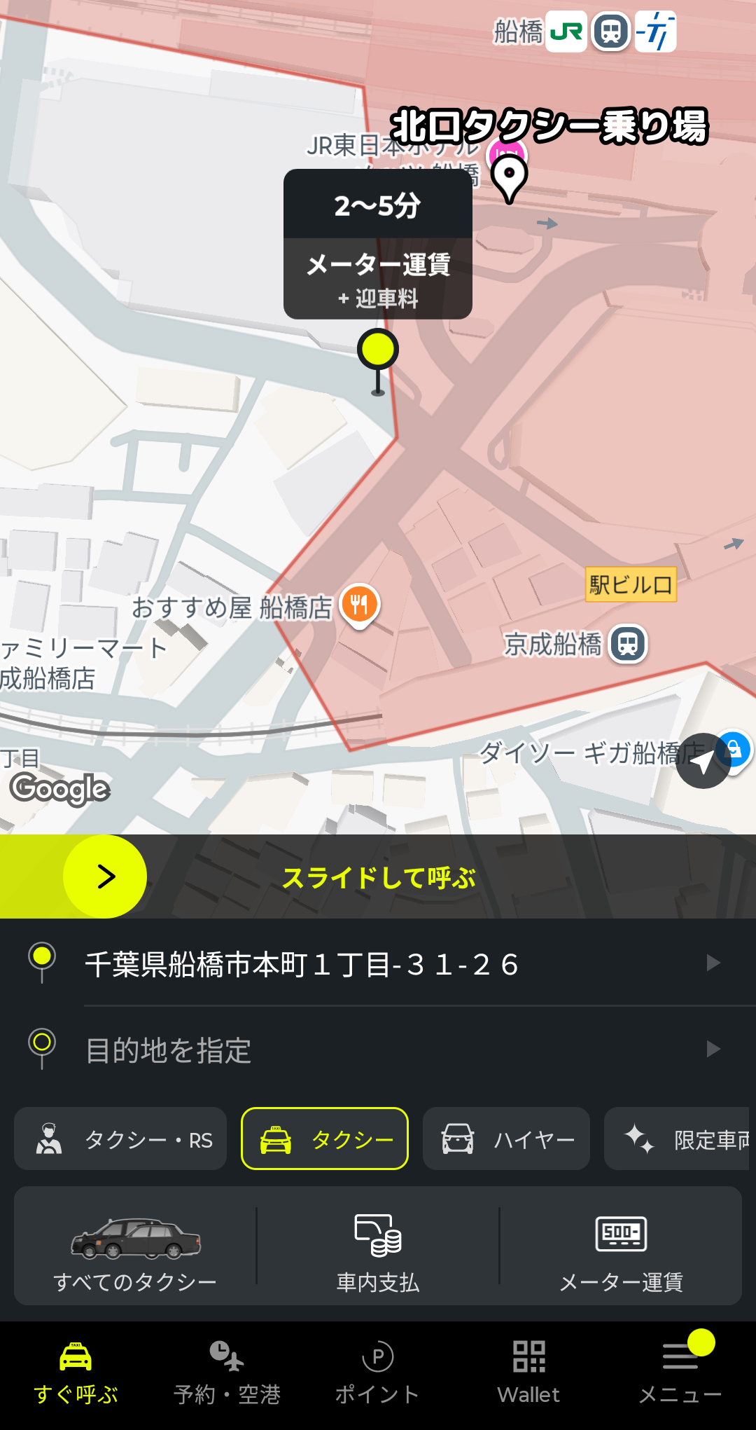 1つ注意点として、駅によってはロータリーに呼べないという制約があるのですが、少し位置をずらすと配車依頼が可能になります。