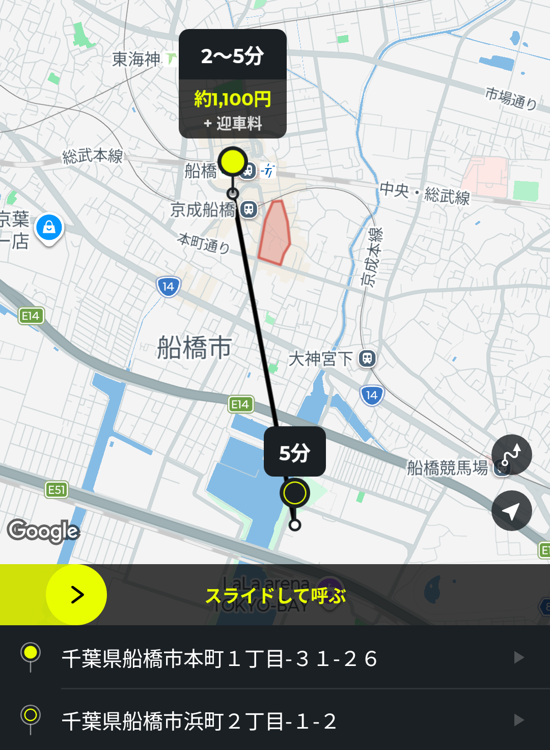あとは、画面中央の黄色いバーをスライドすると、配車依頼ができます。