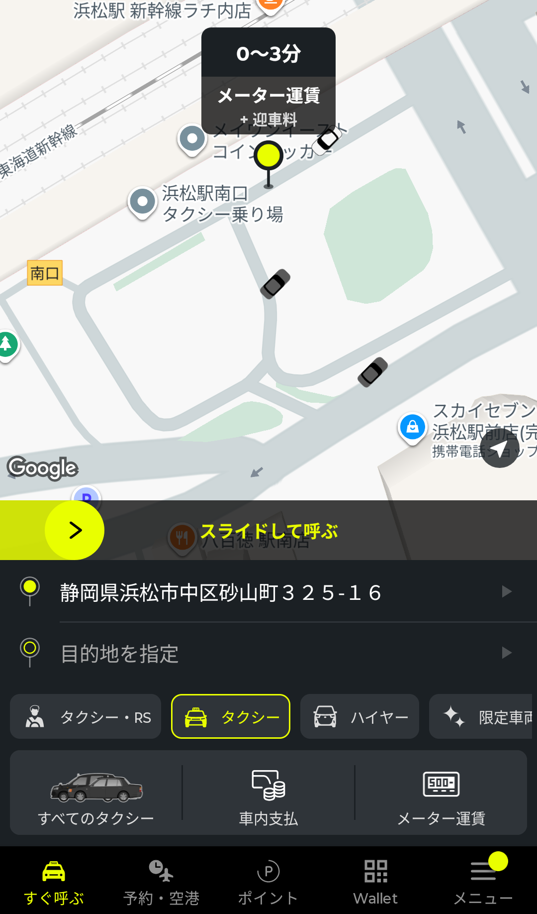 あとは、画面中央の黄色いバーをスライドすると、配車依頼ができます。