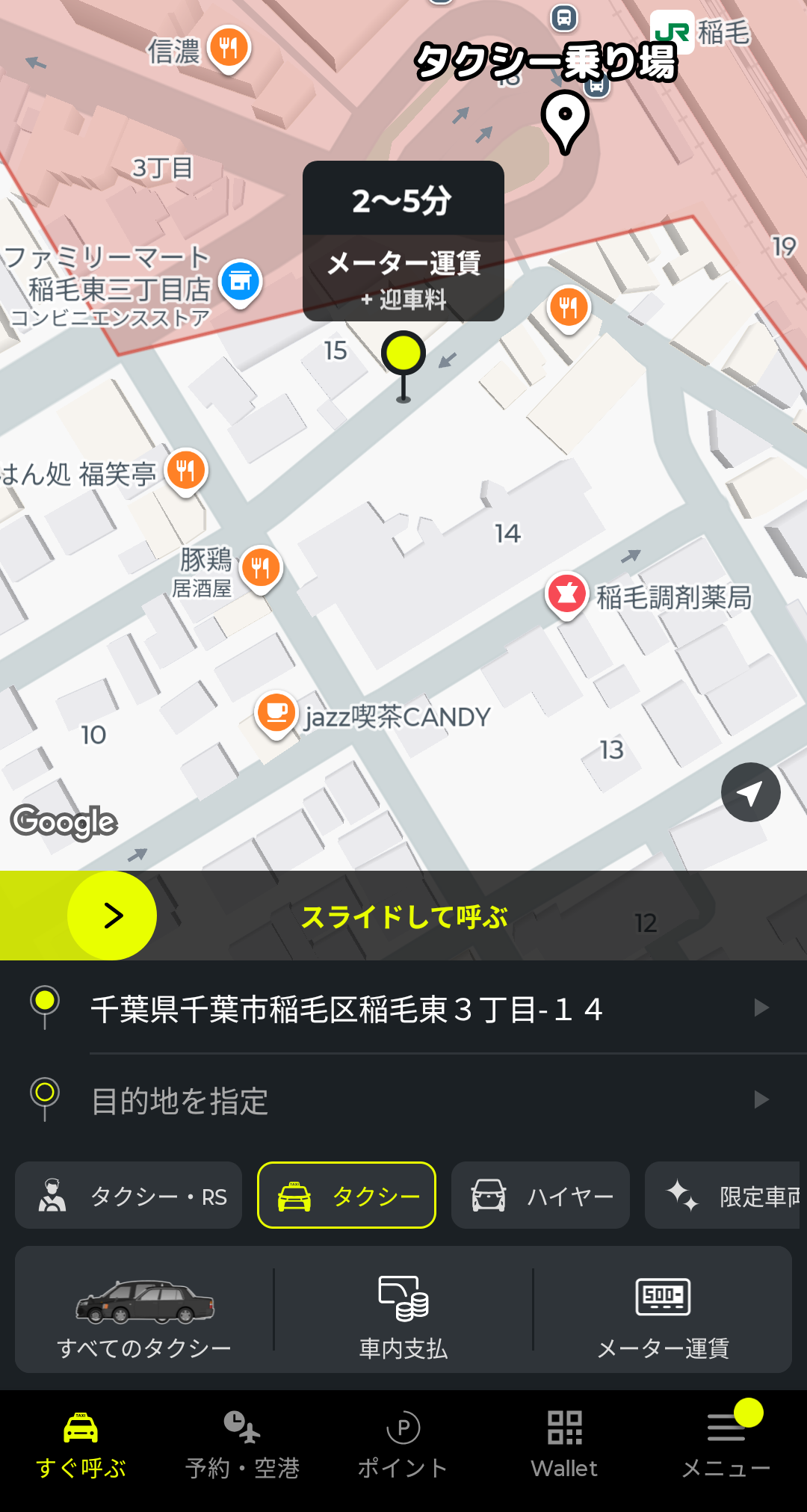 ちなみに、アプリで配車依頼をすると、迎車料金(目安:300〜500円)がかかります。