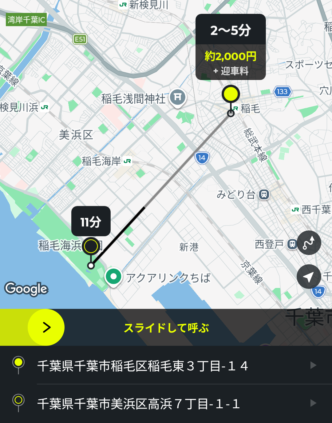 あとは、画面中央の黄色いバーをスライドすると、配車依頼ができます。