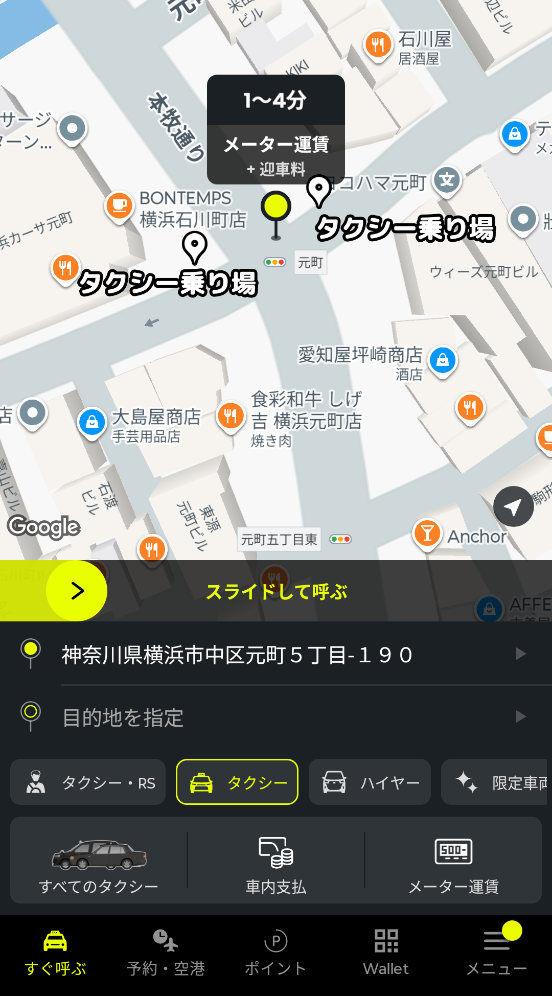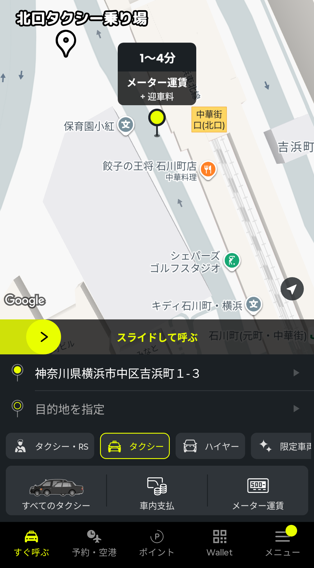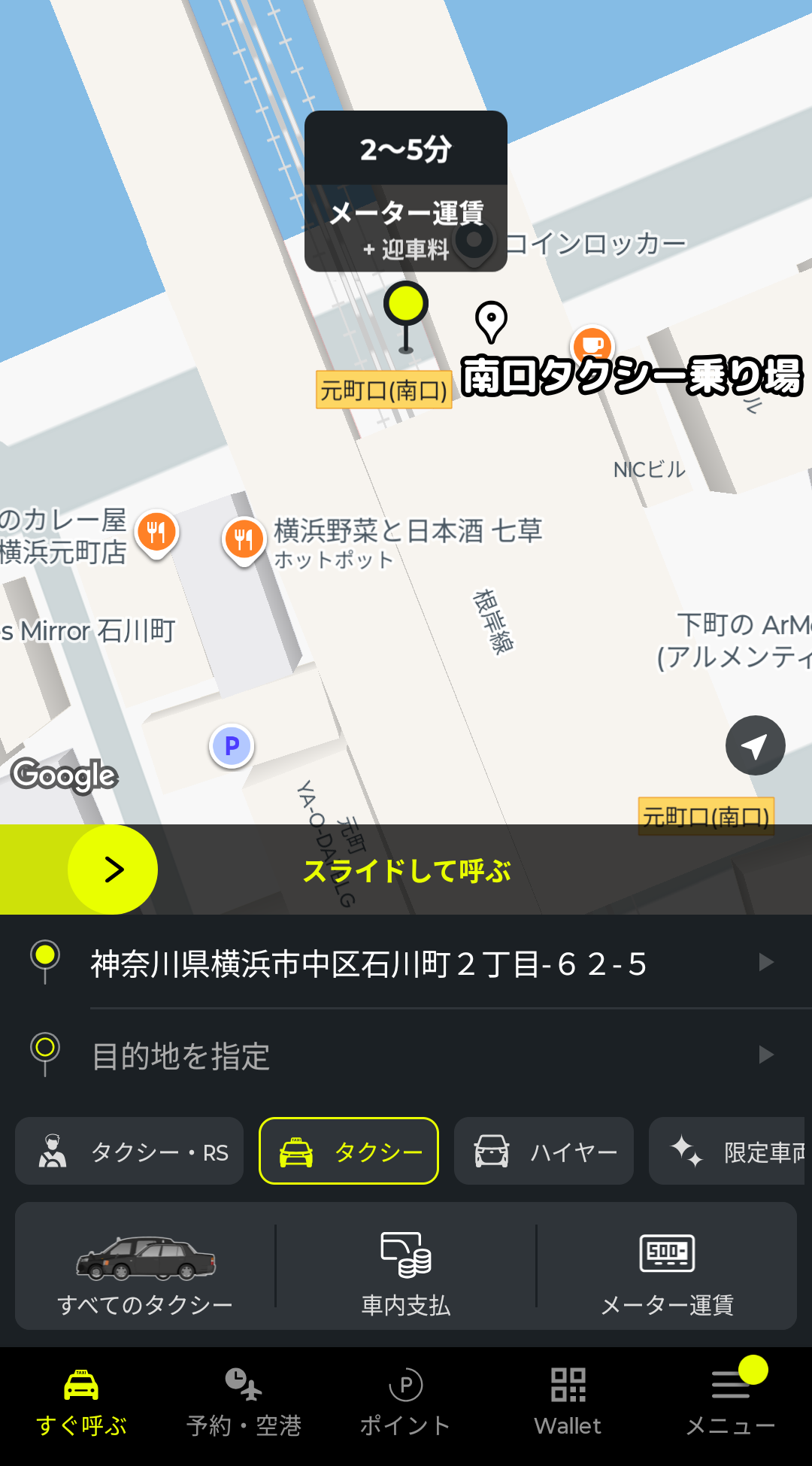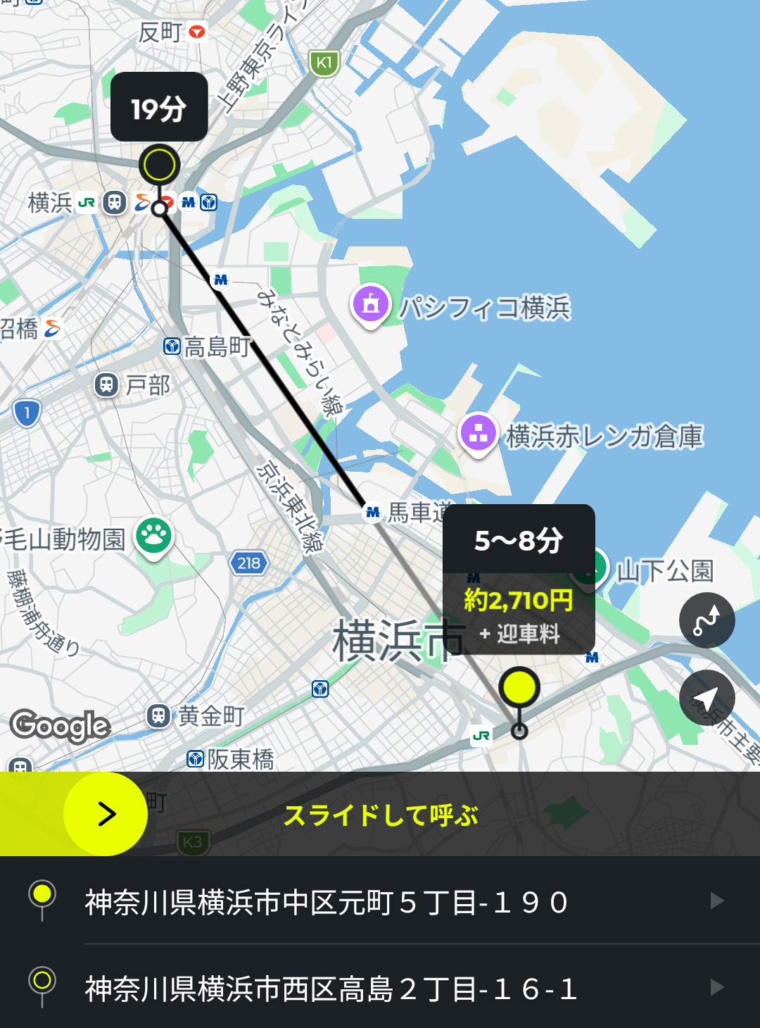 あとは、画面中央の黄色いバーをスライドすると、配車依頼ができます。