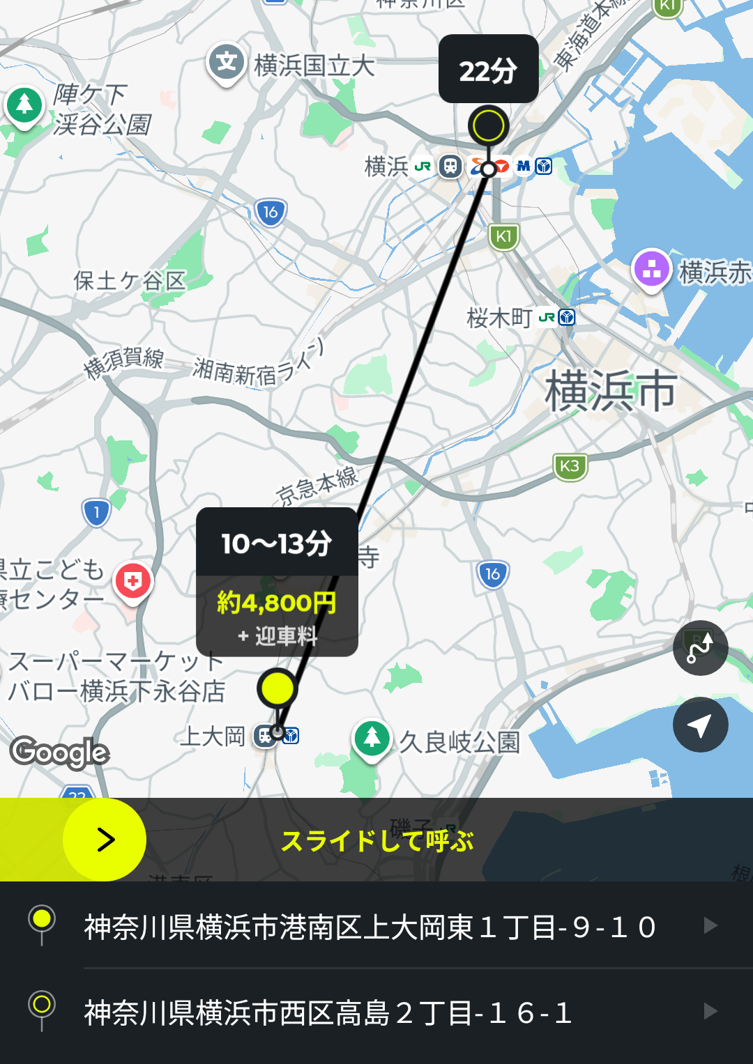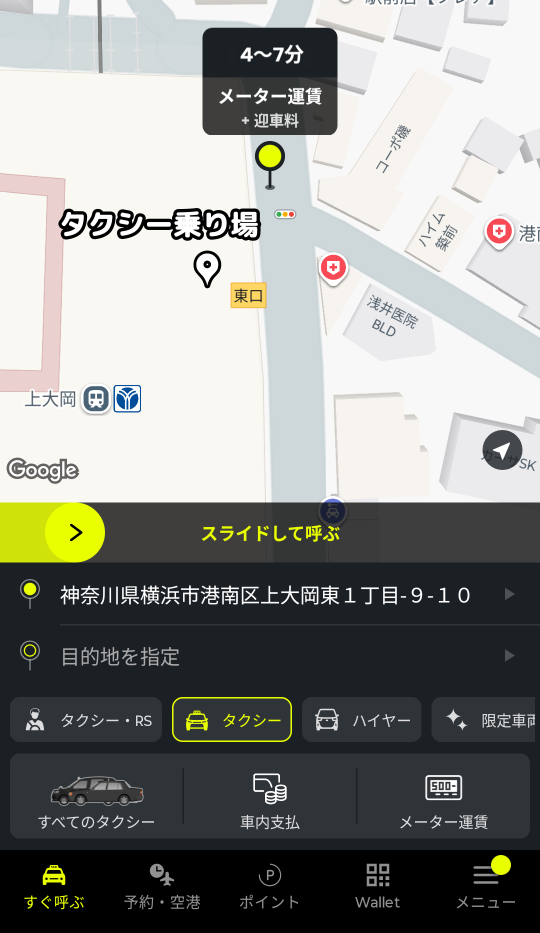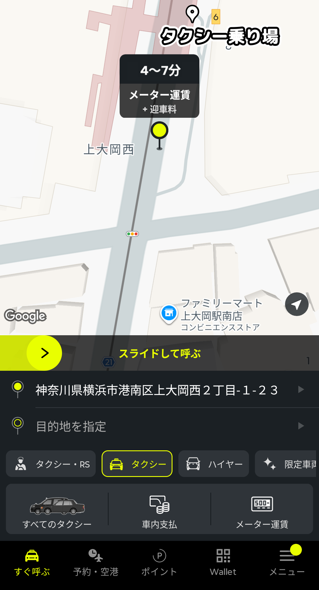 あとは、画面中央の黄色いバーをスライドすると、配車依頼ができます。