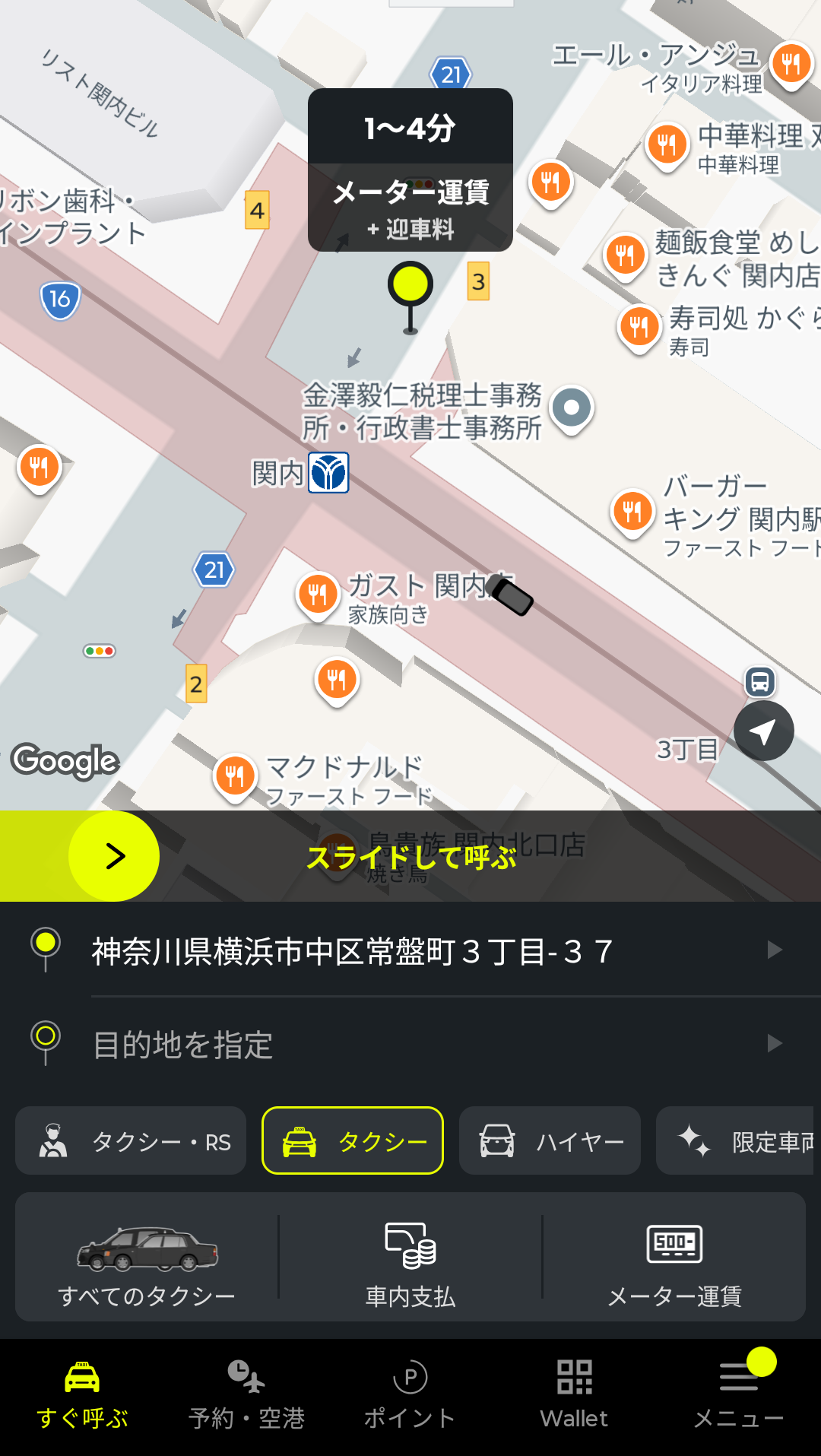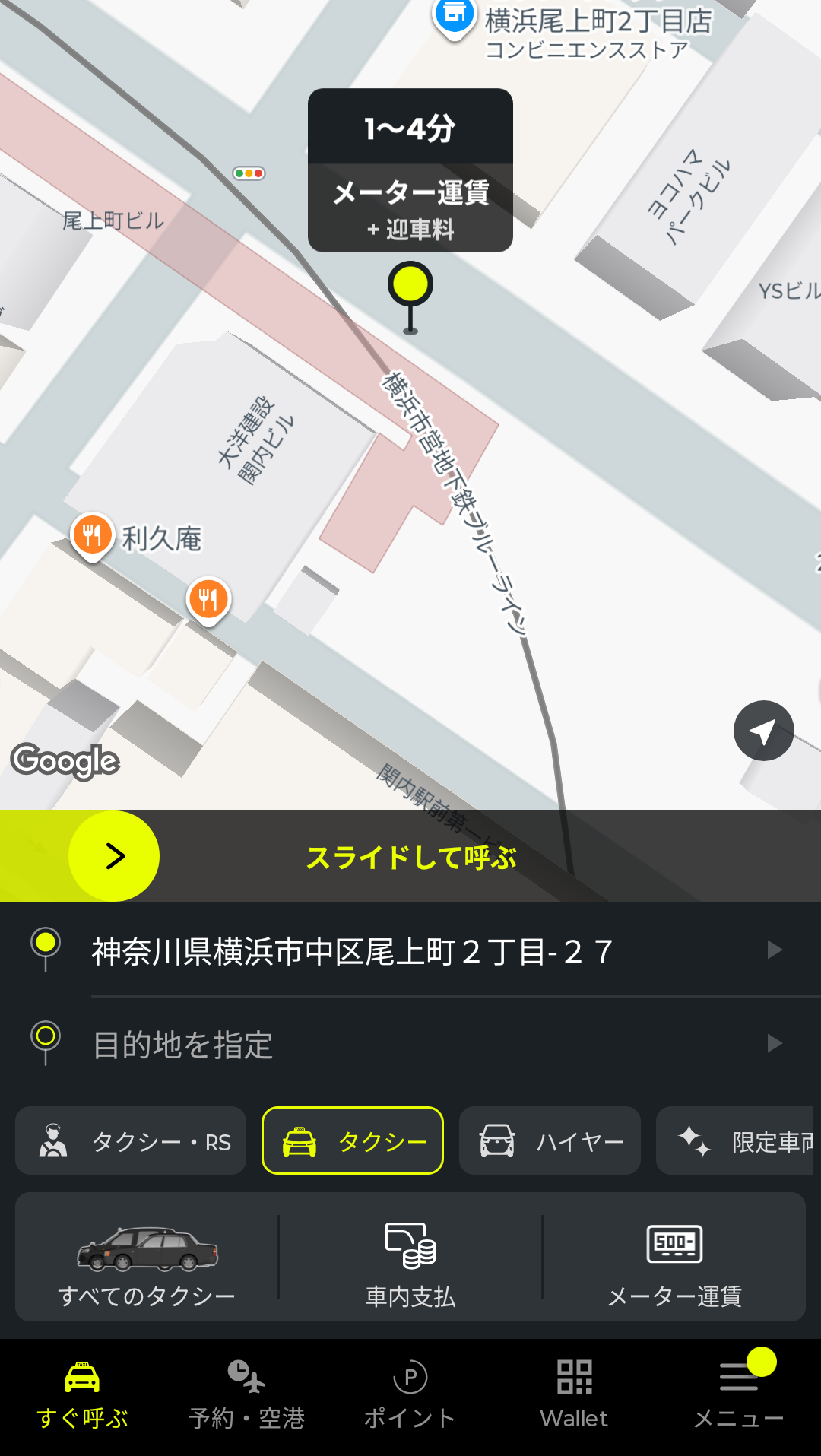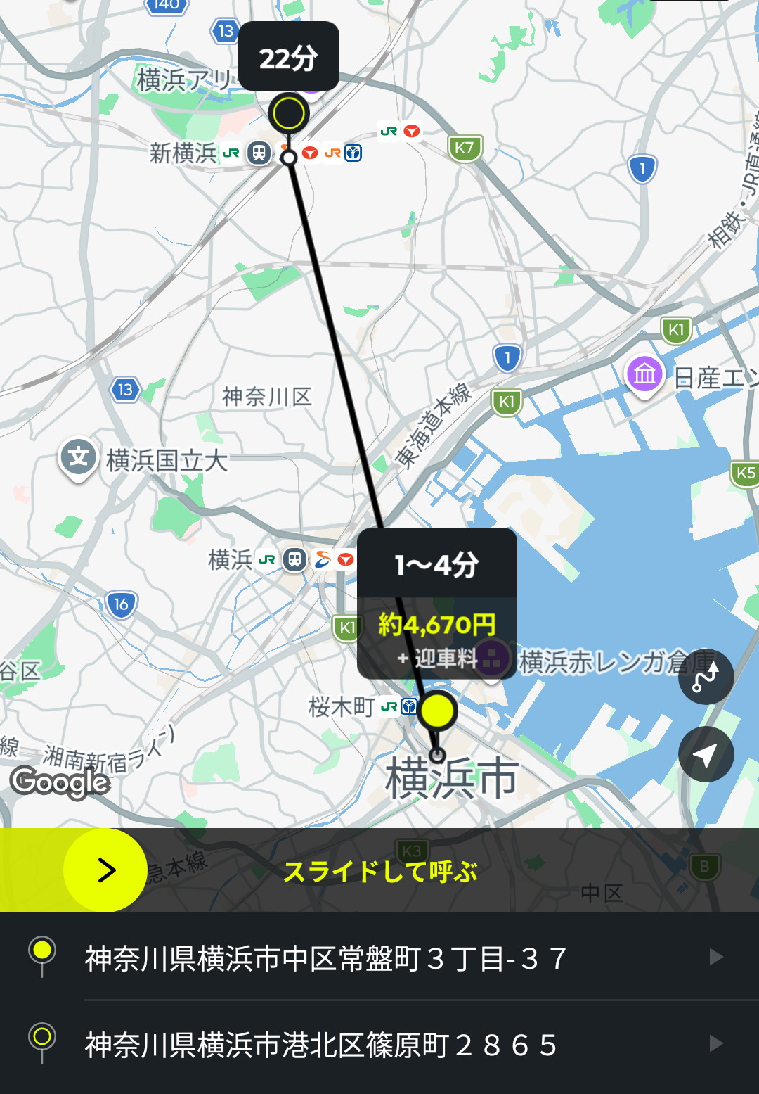 あとは、画面中央の黄色いバーをスライドすると、配車依頼ができます。