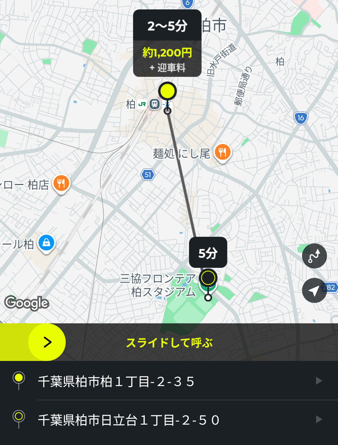 あとは、画面中央の黄色いバーをスライドすると、配車依頼ができます。