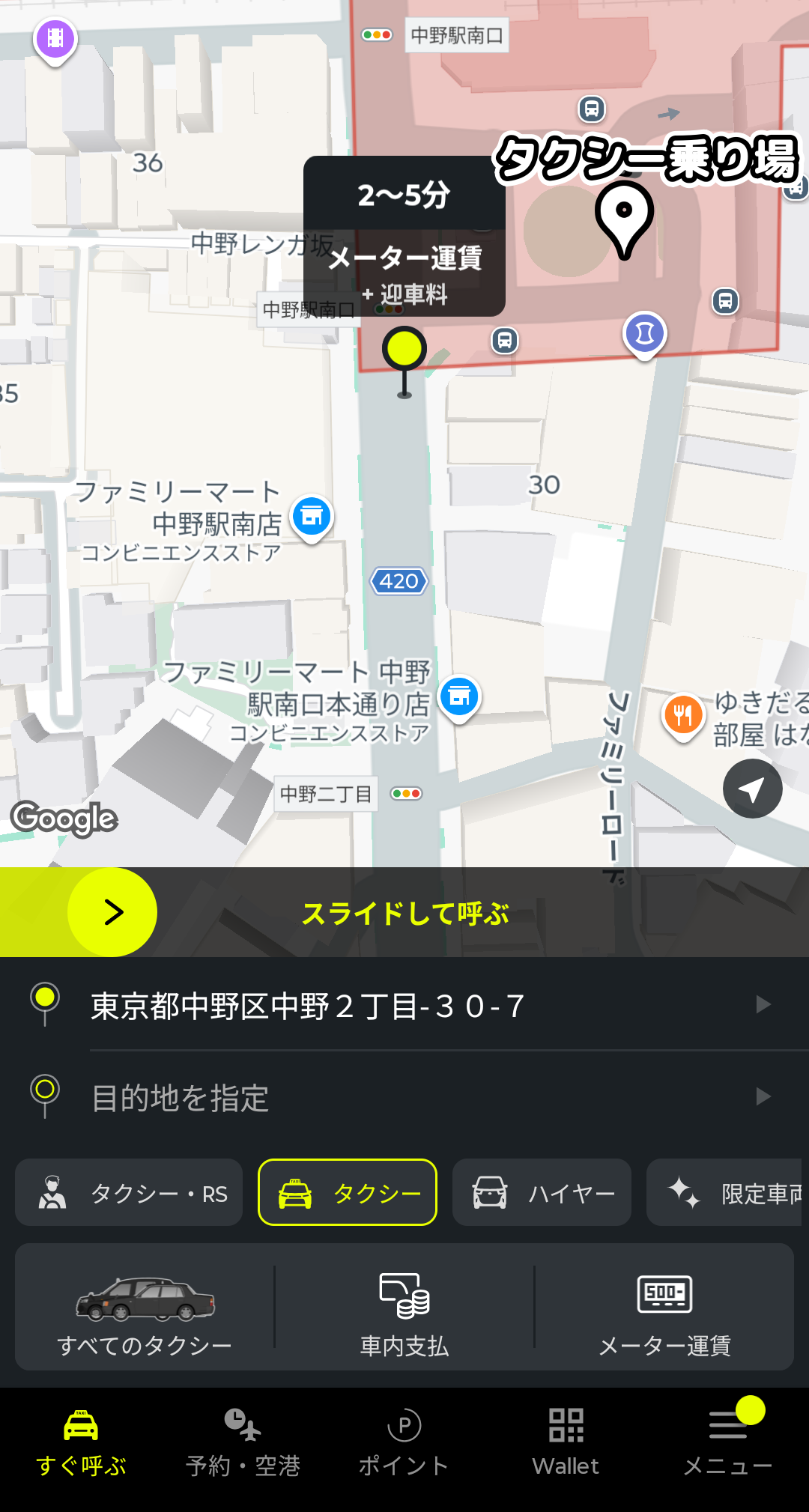 ちなみに、アプリで配車依頼をすると、迎車料金(目安:300〜500円)がかかります。