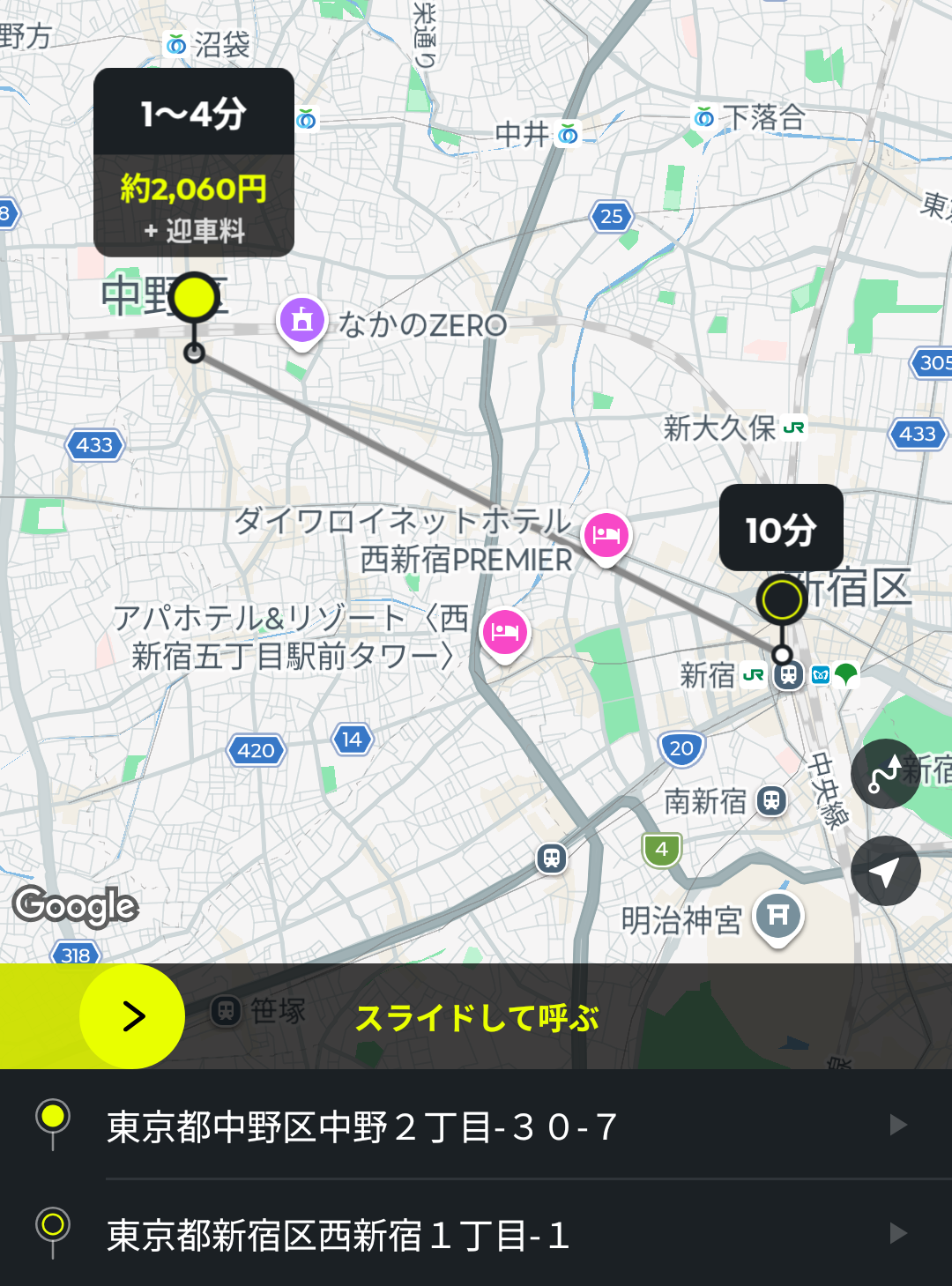 また、実際に配車依頼をしなくても、乗車・降車地点を入力するだけで、実際の道路状況を考慮して目的地までの料金や到着時間の目安を表示してくれるので、これはこれでけっこう便利だったりします。