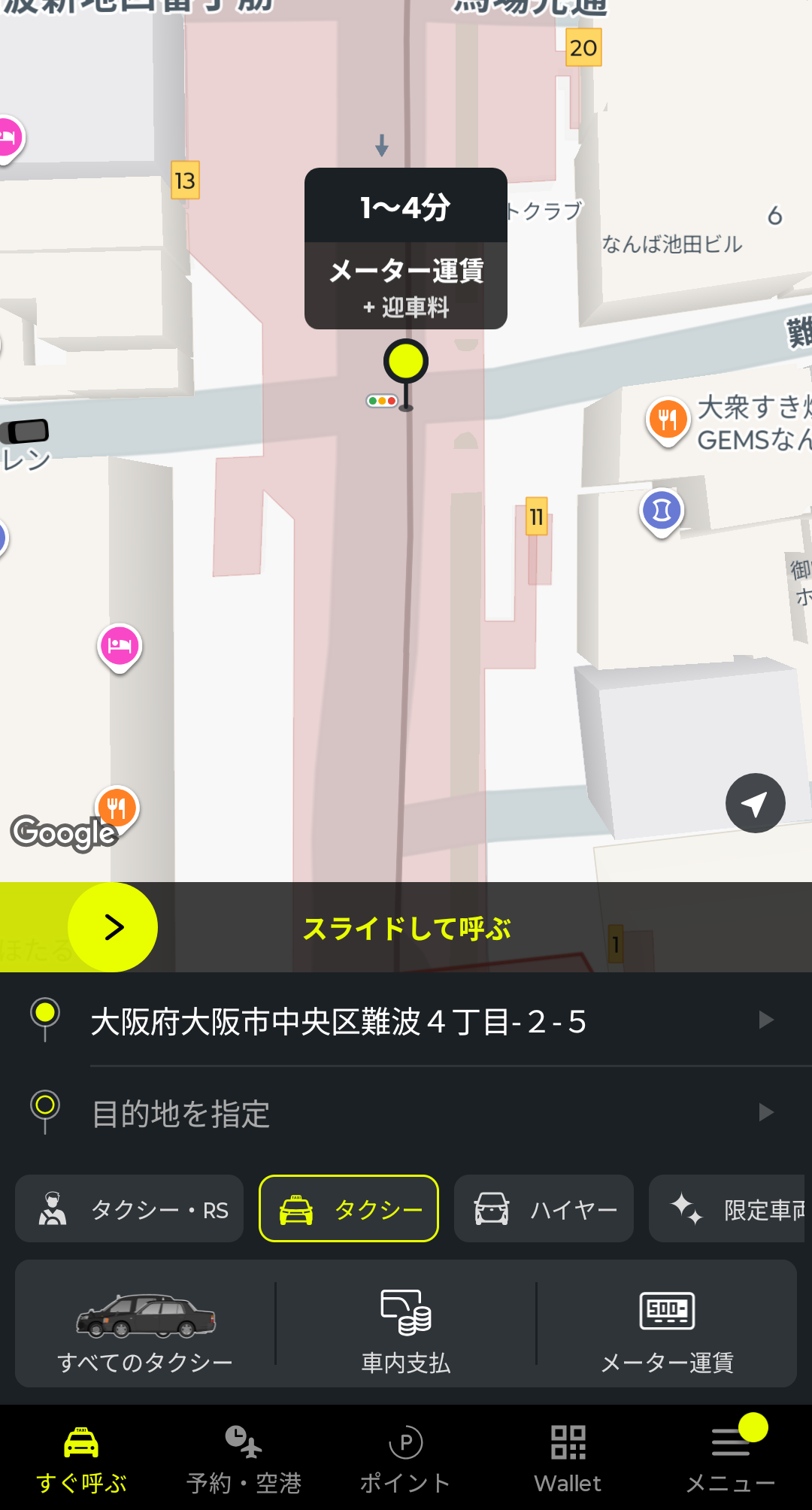 このように難波駅周辺はどこでも配車できるので、わざわざタクシーへ行かずとも、適当な出口から出て目の前の路上に呼ぶという方法がかなり有効です。