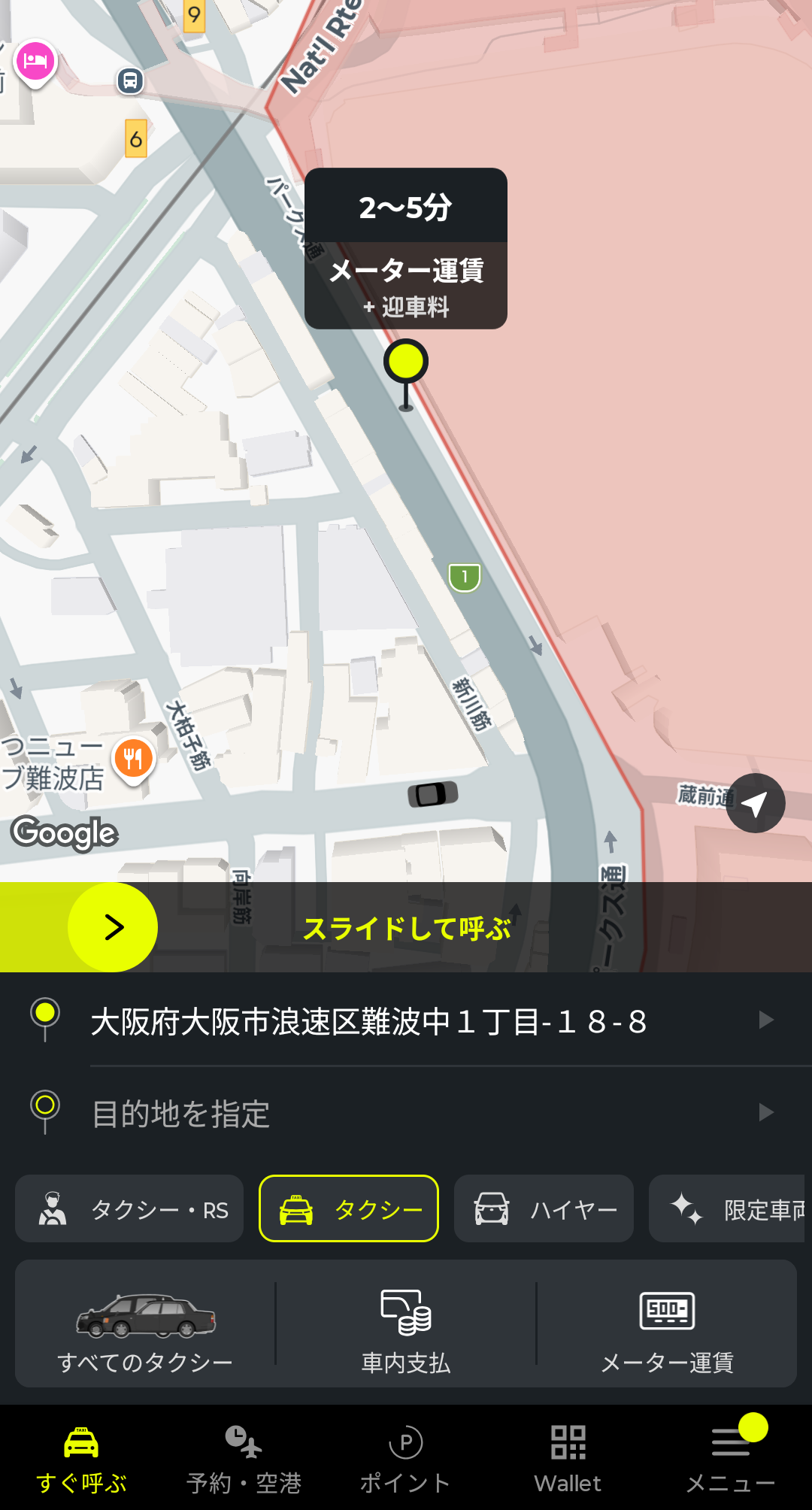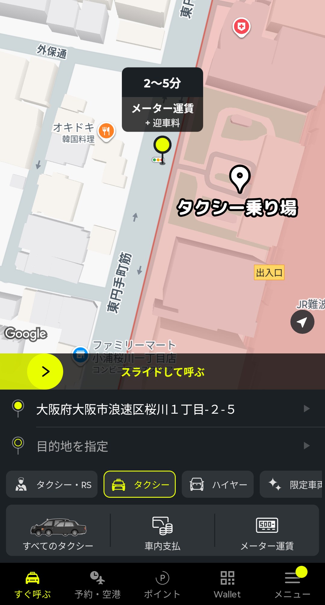ちなみに、アプリで配車依頼をすると、迎車料金(目安:300〜500円)がかかります。