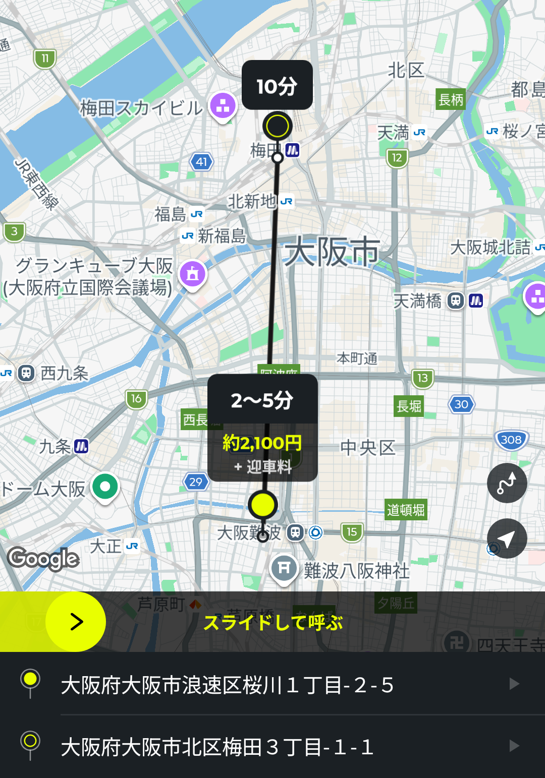 また、実際に配車依頼をしなくても、乗車・降車地点を入力するだけで、実際の道路状況を考慮して目的地までの料金や到着時間の目安を表示してくれるので、これはこれでけっこう便利だったりします。