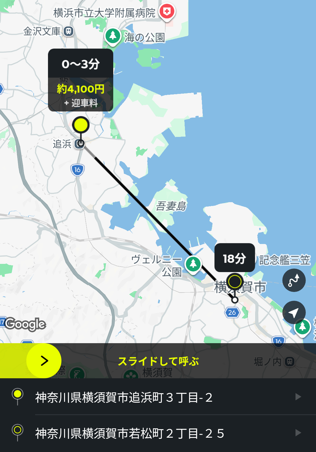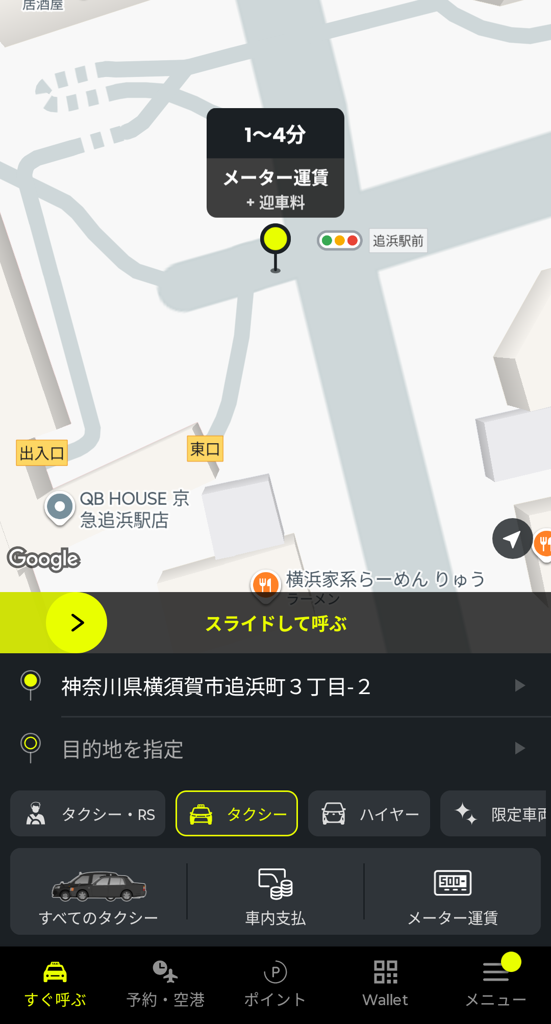 1つ注意点として、駅によっては駅前の道路に呼べないことがあるのですが、追浜駅の場合はそのような制限はなくどこでも配車OK。