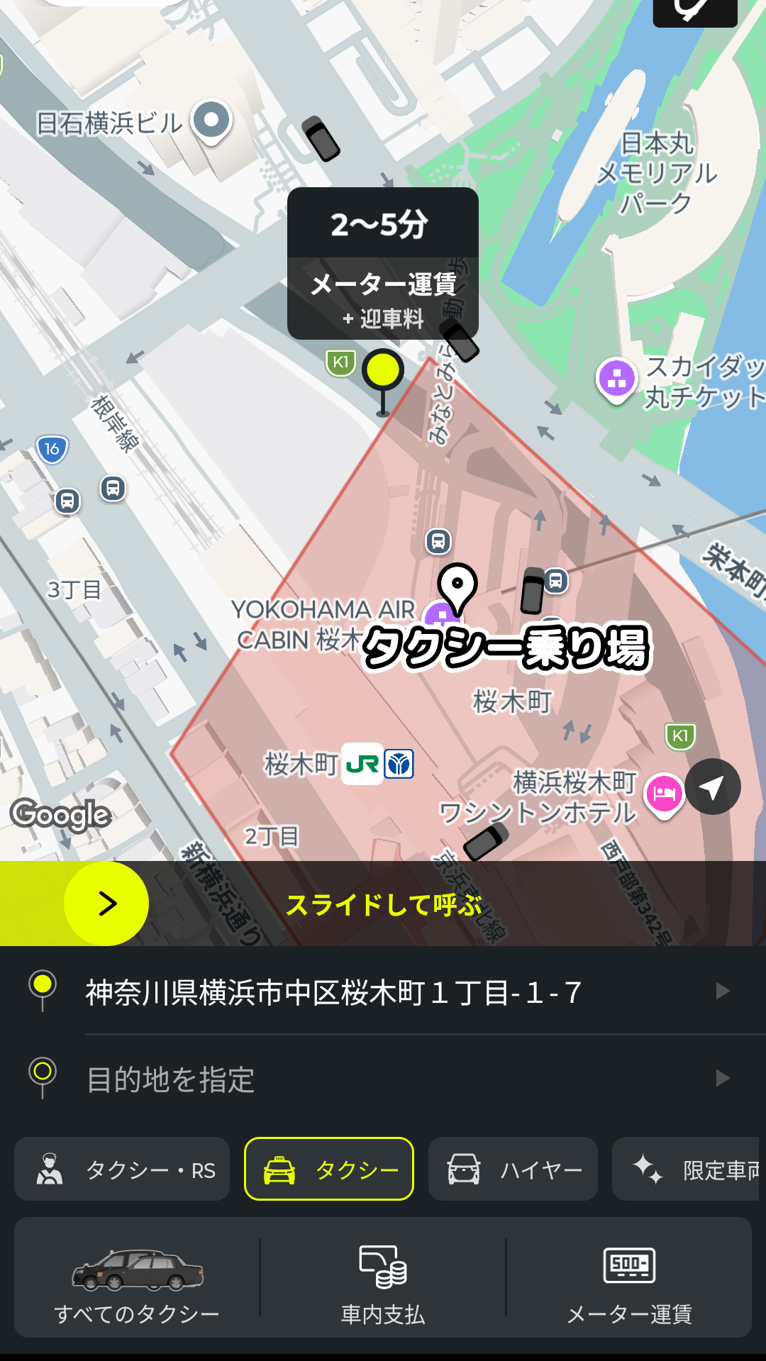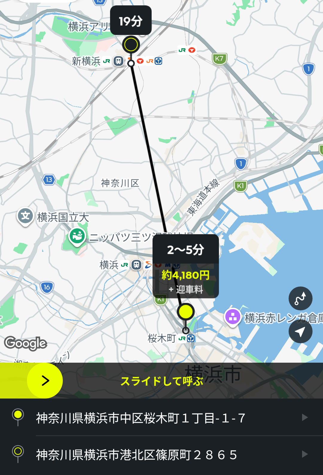 あとは、画面中央の黄色いバーをスライドすると、配車依頼ができます。
