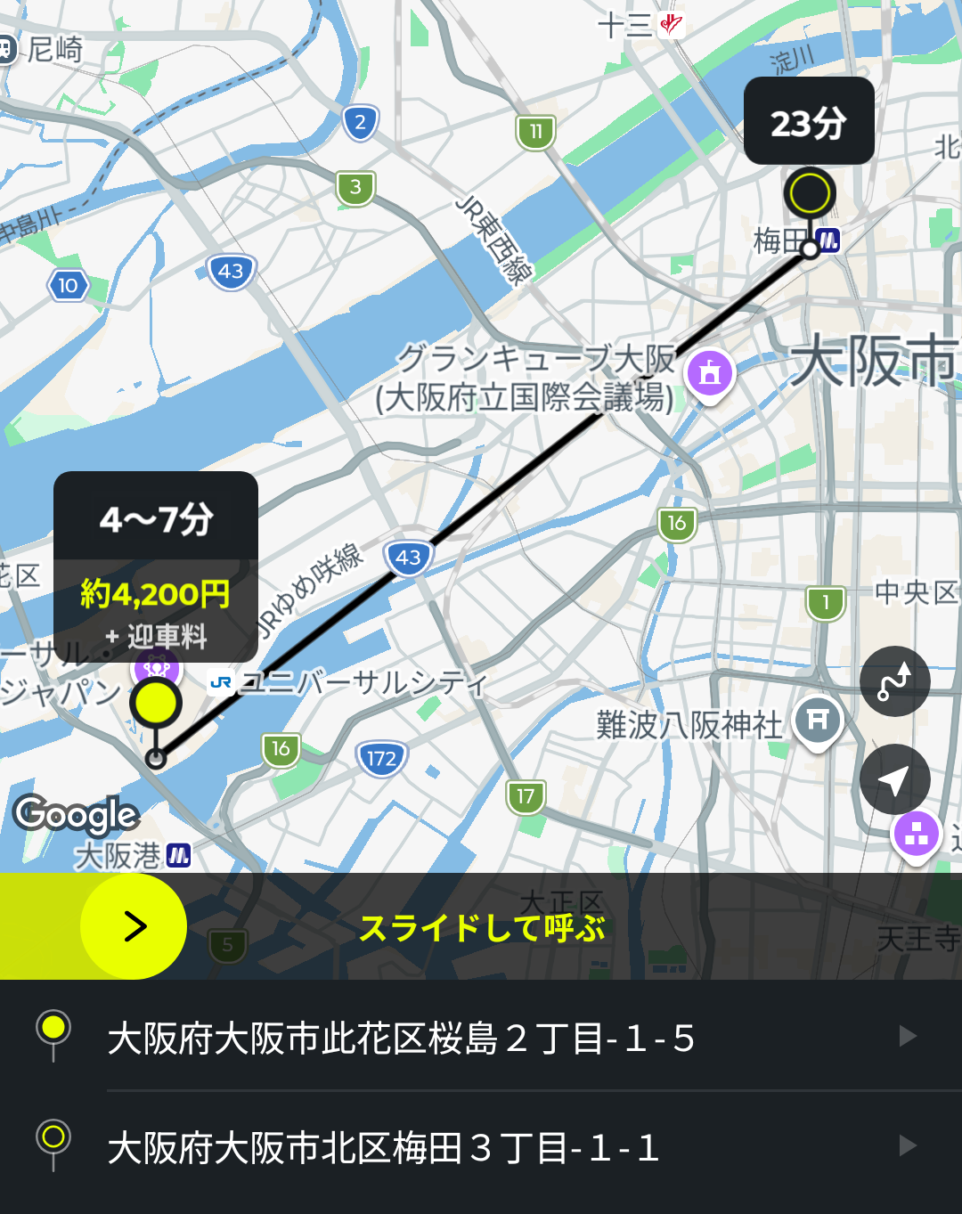 あとは、画面中央の黄色いバーをスライドすると、配車依頼ができます。