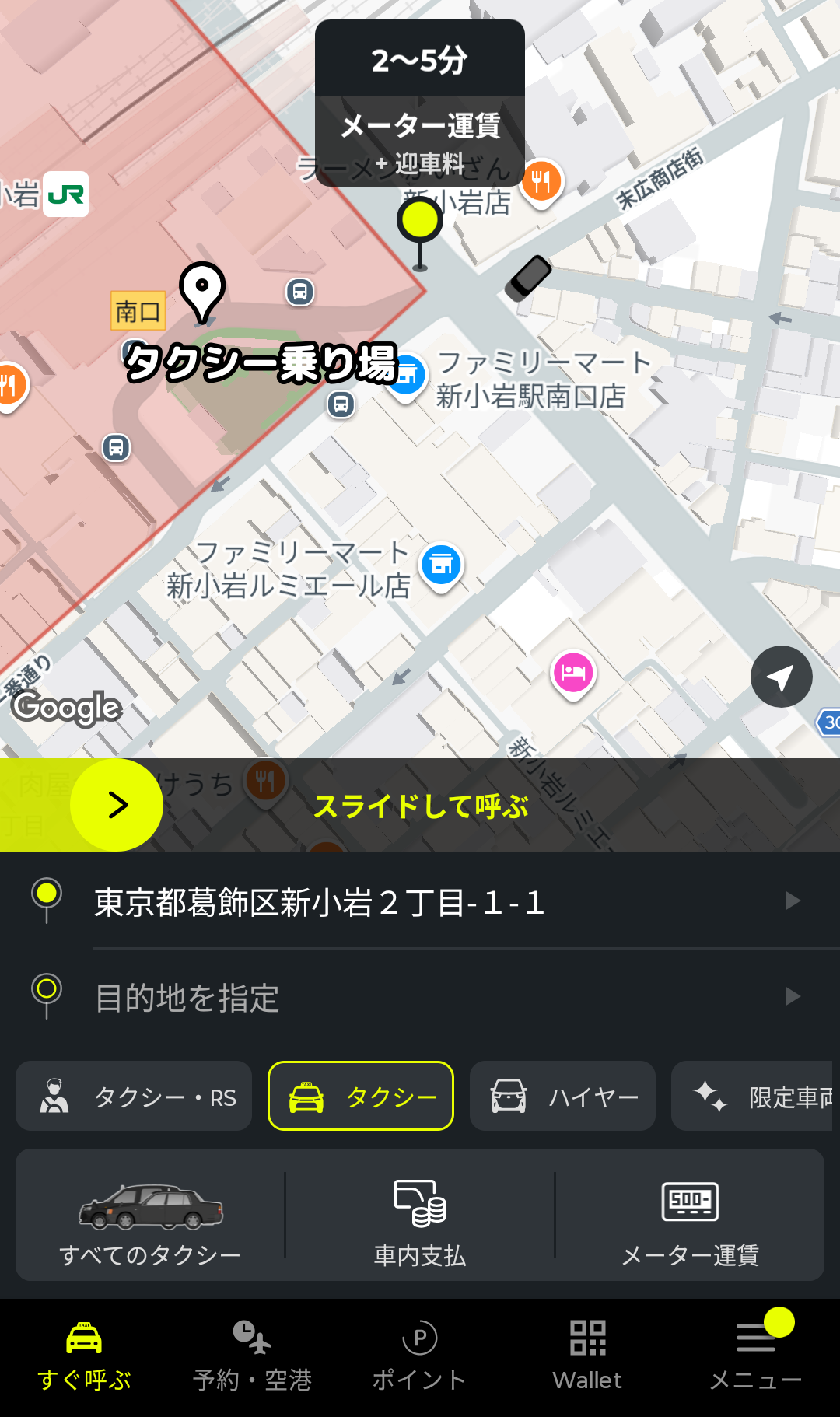 提携タクシー数が都内最大級!アプリを起動したら「スライドするだけ」のワンアクションで一番近い車両がすぐにお迎えに来ます。