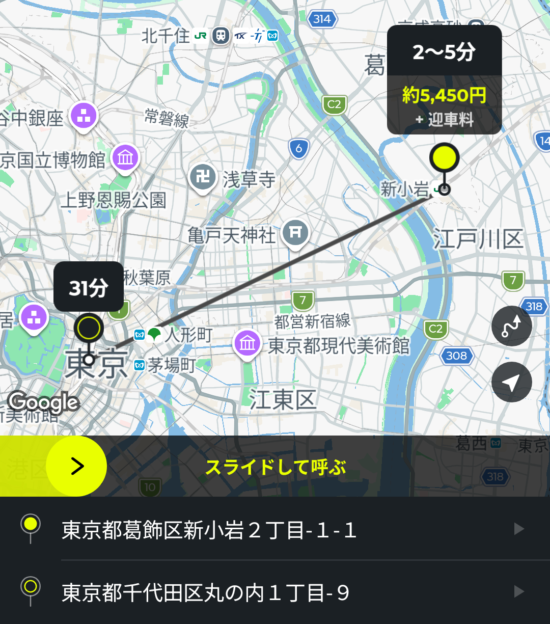 また、実際に配車依頼をしなくても、乗車・降車地点を入力するだけで、実際の道路状況を考慮して目的地までの料金や到着時間の目安を表示してくれるので、これはこれでけっこう便利だったりします。