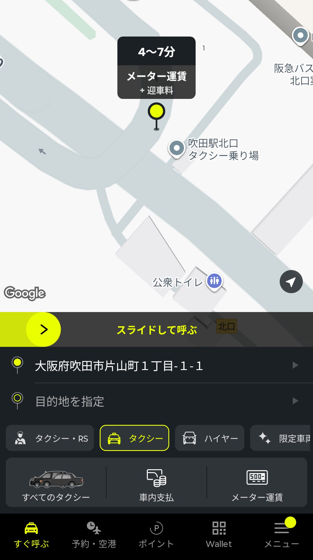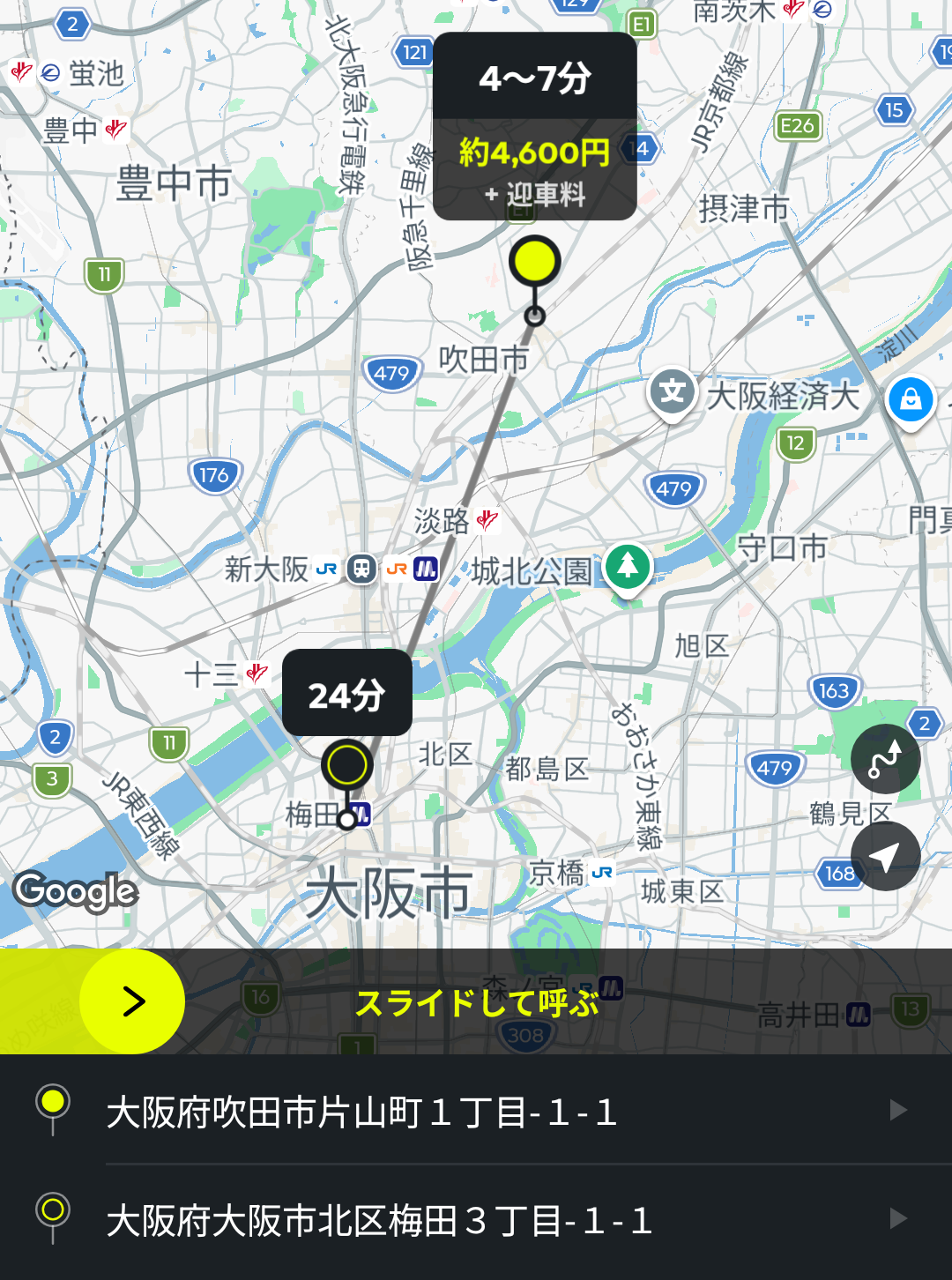 ちなみに、アプリで配車依頼をすると、迎車料金(目安:300〜500円)がかかります。