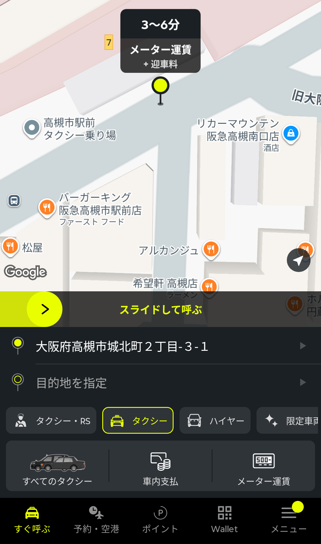 ちなみに、アプリで配車依頼をすると、迎車料金(目安:300〜500円)がかかります。