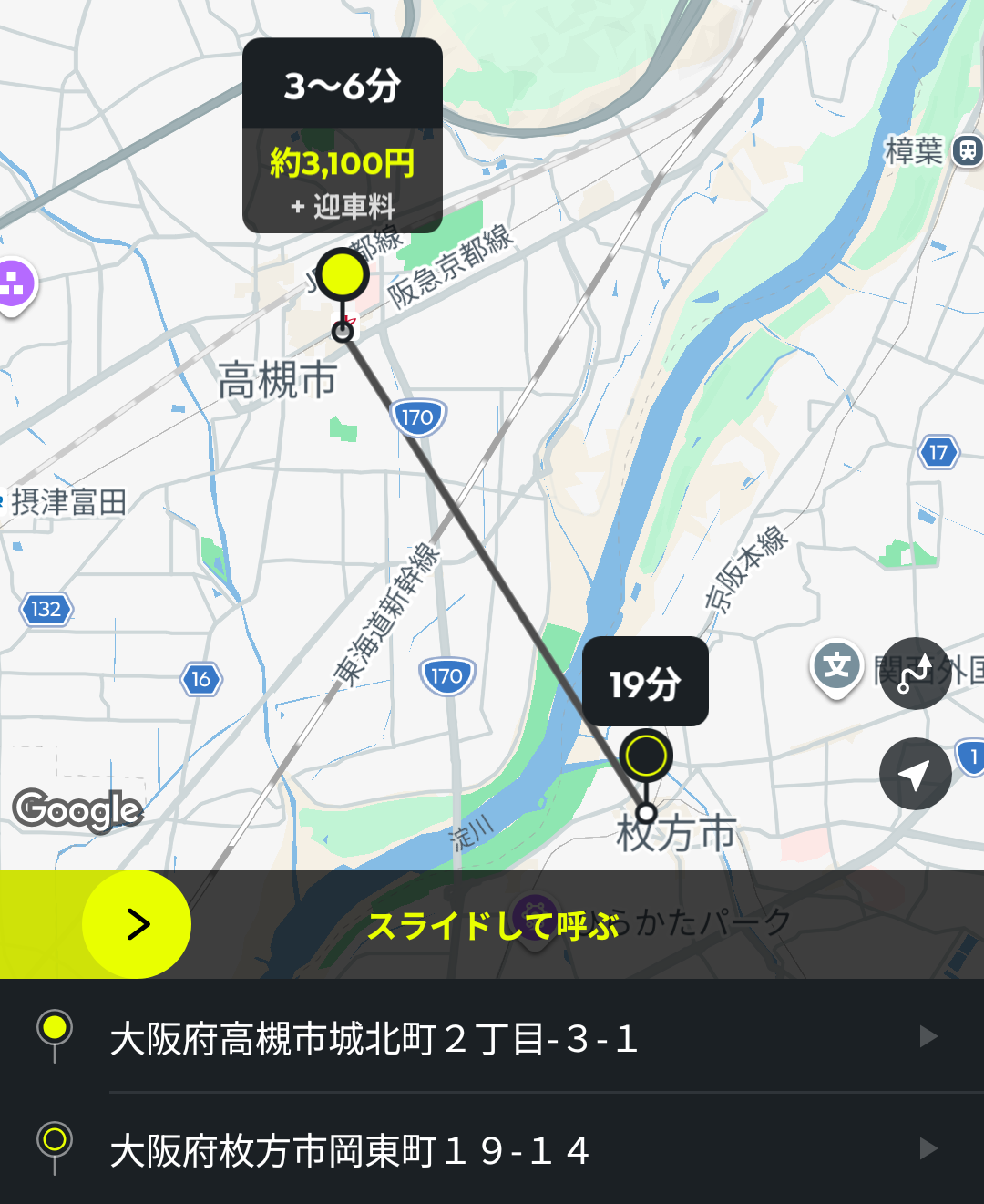 また、実際に配車依頼をしなくても、乗車・降車地点を入力するだけで、実際の道路状況を考慮して目的地までの料金や到着時間の目安を表示してくれるので、これはこれでけっこう便利だったりします。