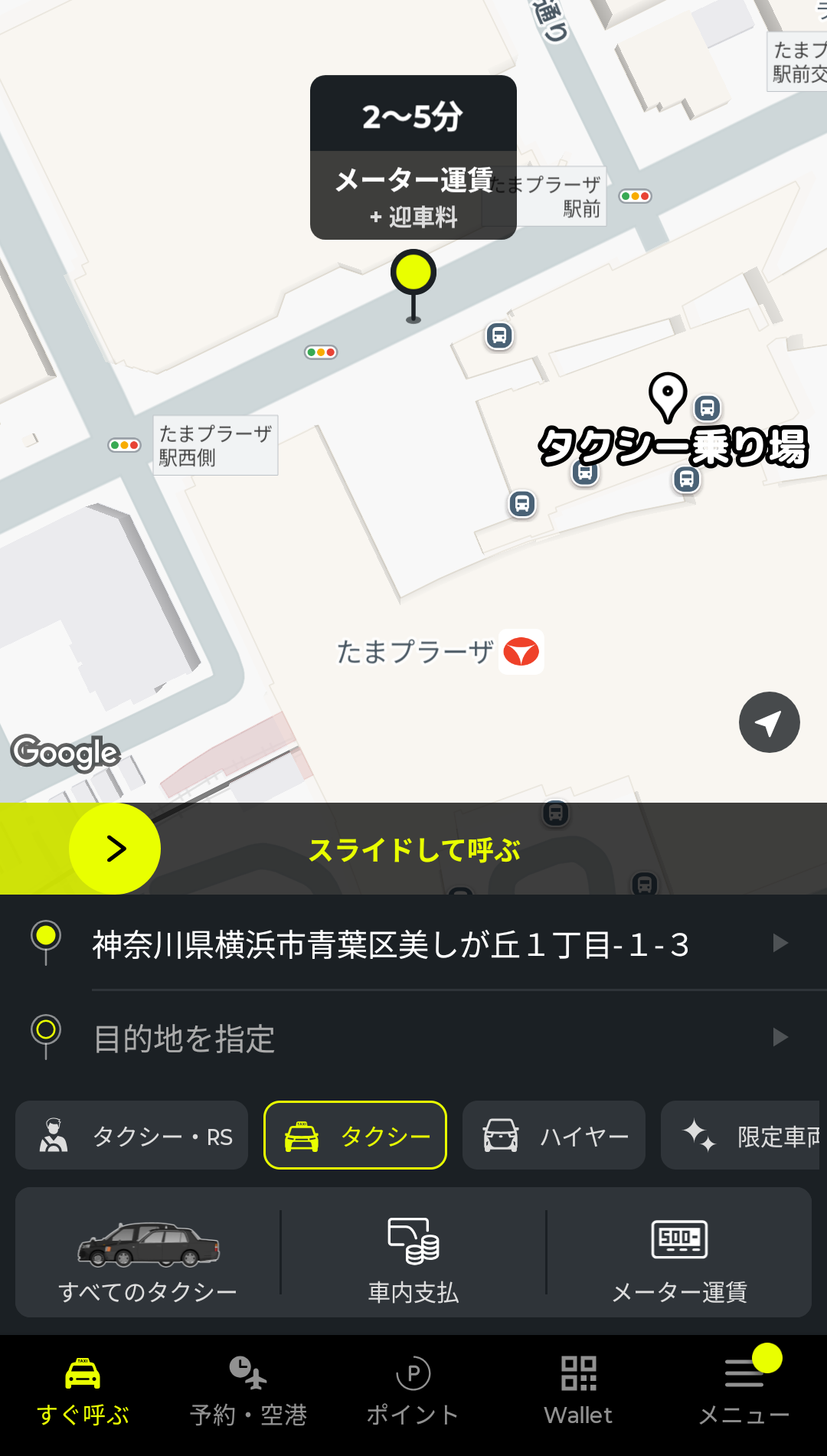 提携タクシー数が都内最大級!アプリを起動したら「スライドするだけ」のワンアクションで一番近い車両がすぐにお迎えに来ます。