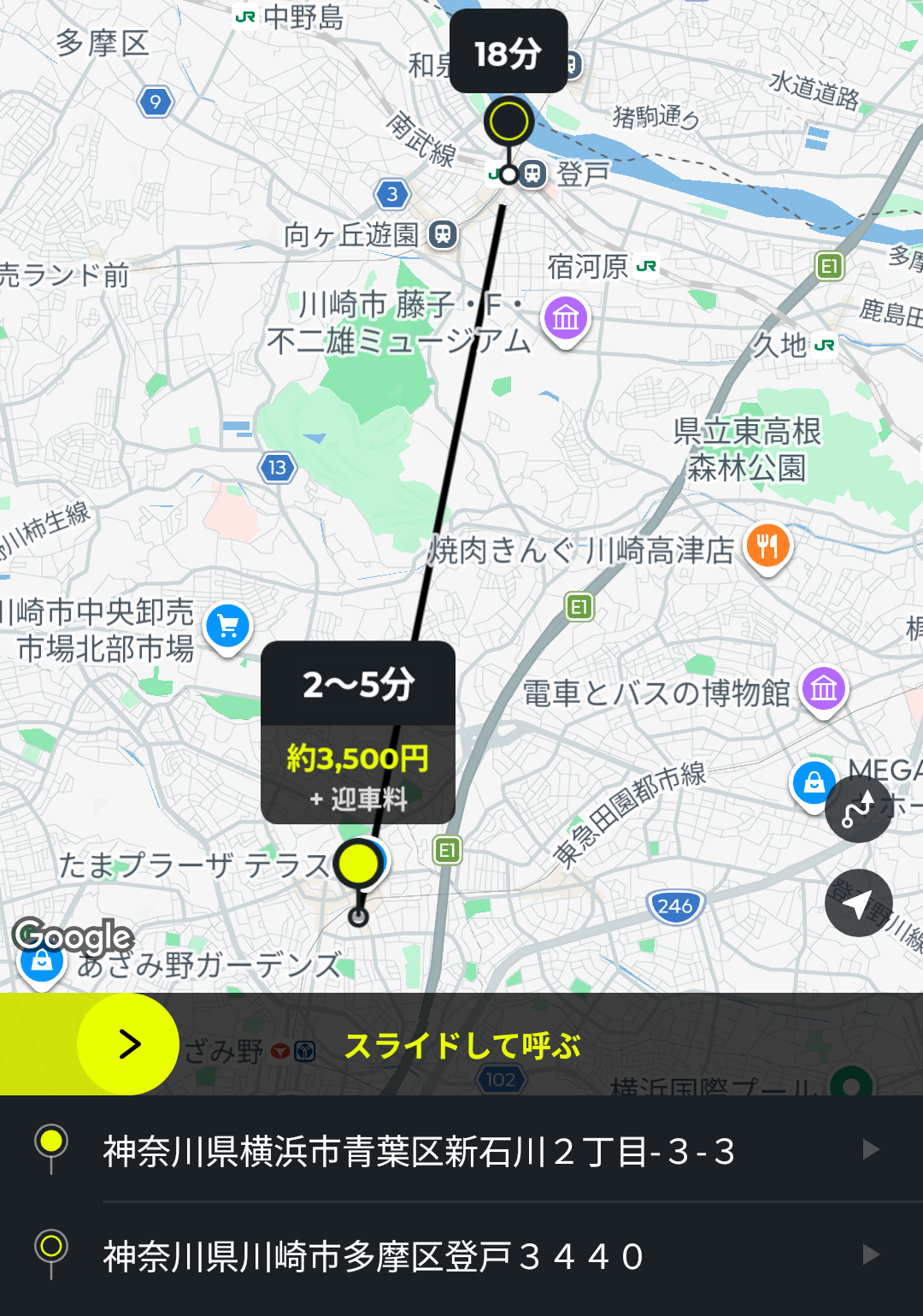 また、実際に配車依頼をしなくても、乗車・降車地点を入力するだけで、実際の道路状況を考慮して目的地までの料金や到着時間の目安を表示してくれるので、これはこれでけっこう便利だったりします。