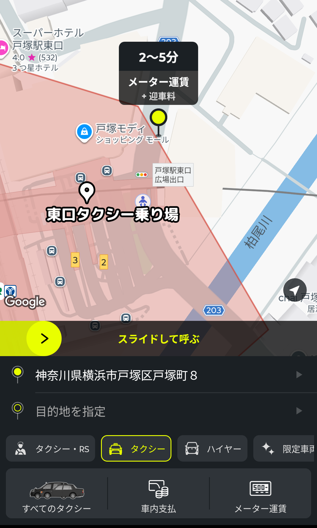 戸塚駅の周辺には、もう1つタクシー乗り場があって、それが緑のアイコンのところ。