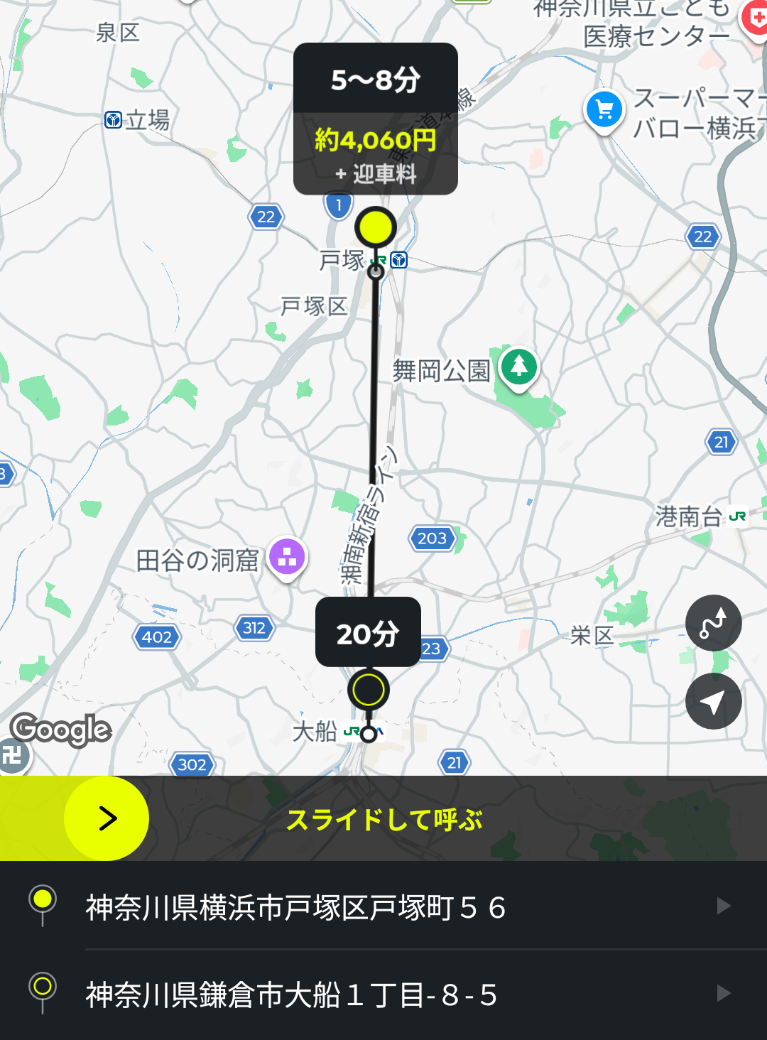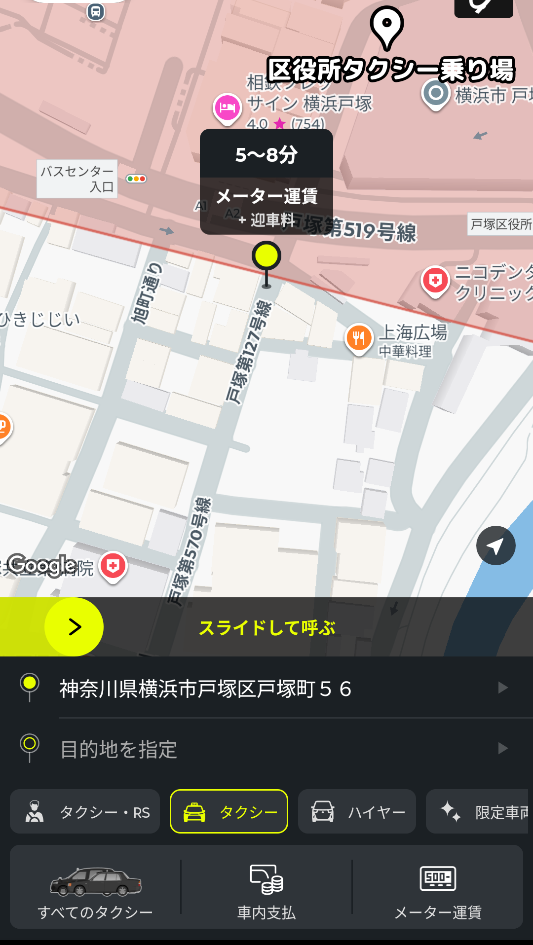 あとは、画面中央の黄色いバーをスライドすると、配車依頼ができます。