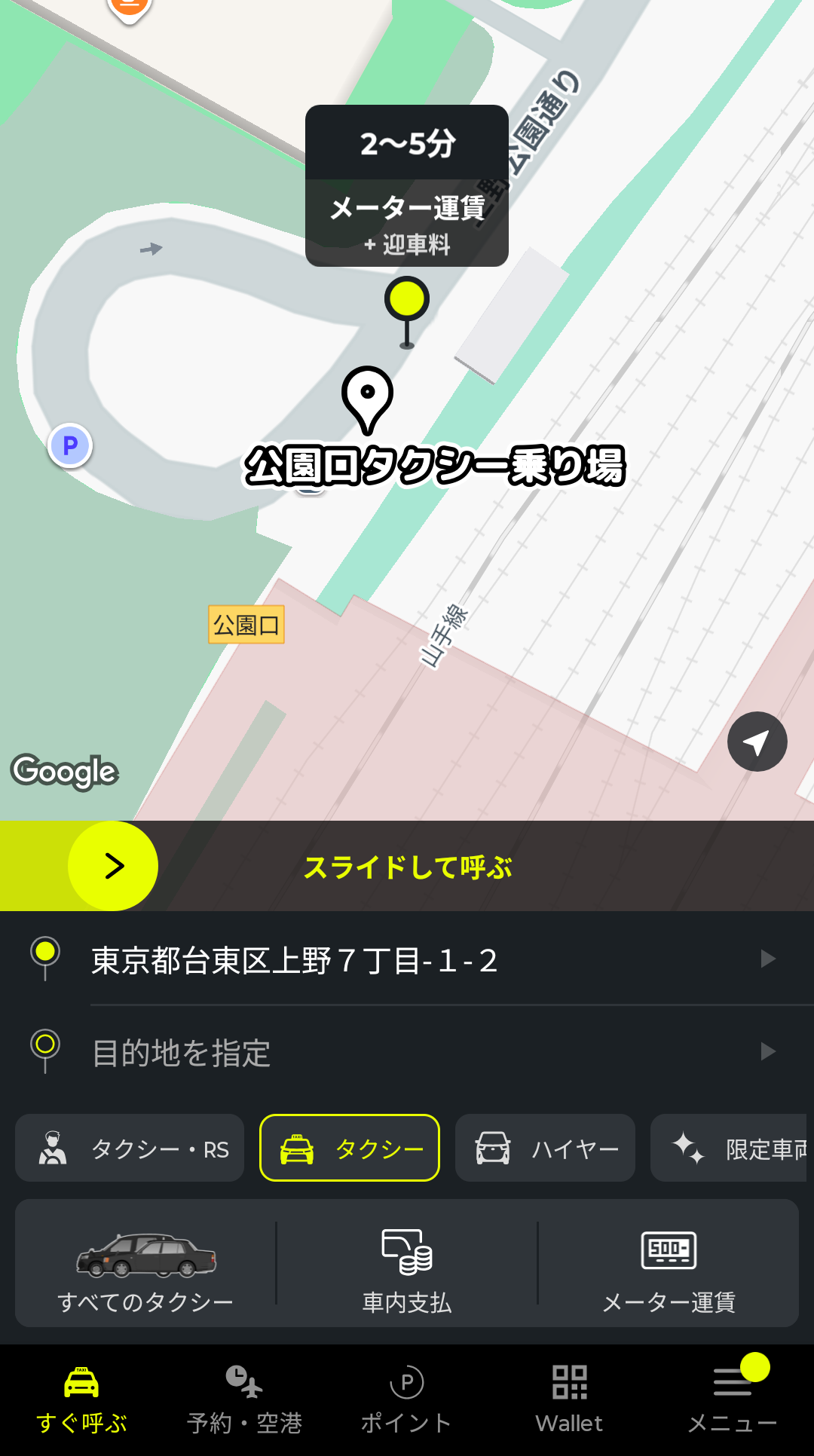 提携タクシー数が都内最大級!アプリを起動したら「スライドするだけ」のワンアクションで一番近い車両がすぐにお迎えに来ます。